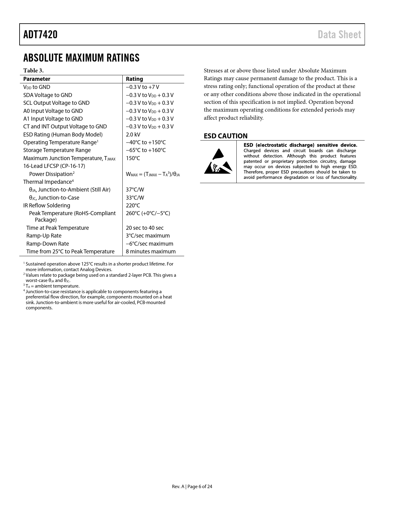 ADT7420. Data Sheet. ABSOLUTE MAXIMUM RATINGS Table 3. Parameter. Rating. ESD CAUTION