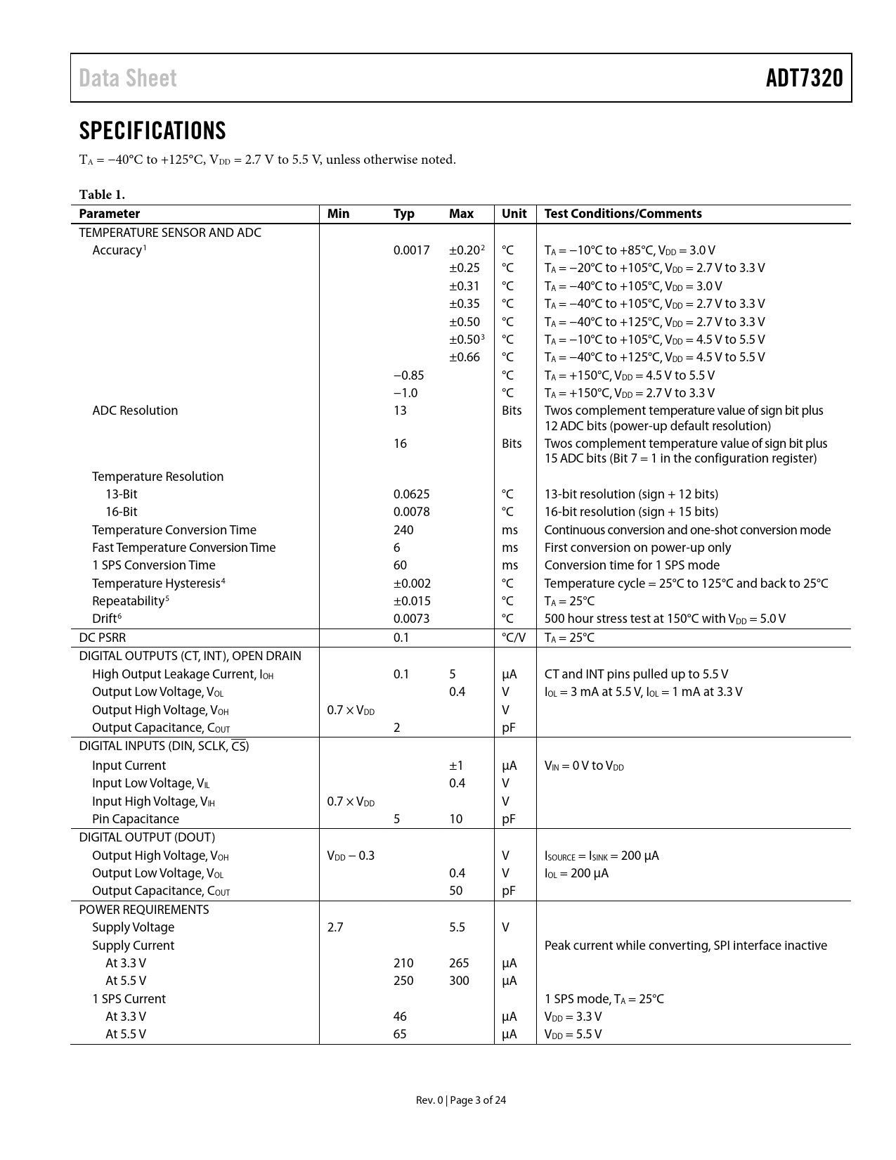 Data Sheet. ADT7320. SPECIFICATIONS. Table 1. Parameter. Min. Typ. Max. Unit Test Conditions/Comments