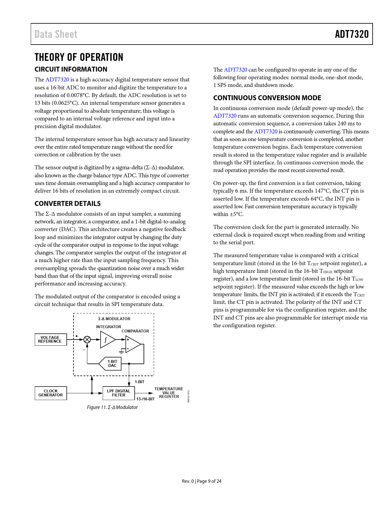 Data SheetADT7320THEORY OF OPERATION CIRCUIT INFORMATION The ADT7320 can be configured to operate in any one of the The ADT7320 is a high accuracy digital temperature sensor that following four operating modes: normal mode, one-shot mode, uses a 16-bit ADC to monitor and digitize the temperature to a 1 SPS mode, and shutdown mode. resolution of 0.0078°C. By default, the ADC resolution is set to CONTINUOUS CONVERSION MODE 13 bits (0.0625°C). An internal temperature sensor generates a voltage proportional to absolute temperature; this voltage is In continuous conversion mode (default power-up mode), the compared to an internal voltage reference and input into a ADT7320 runs an automatic conversion sequence. During this precision digital modulator. automatic conversion sequence, a conversion takes 240 ms to complete and the ADT7320 is continuously converting. This means The internal temperature sensor has high accuracy and linearity that as soon as one temperature conversion is completed, another over the entire rated temperature range without the need for temperature conversion begins. Each temperature conversion correction or calibration by the user. result is stored in the temperature value register and is available through the SPI interface. In continuous conversion mode, the The sensor output is digitized by a sigma-delta (Σ-Δ) modulator, read operation provides the most recent converted result. also known as the charge balance type ADC. This type of converter uses time domain oversampling and a high accuracy comparator to On power-up, the first conversion is a fast conversion, taking deliver 16 bits of resolution in an extremely compact circuit. typically 6 ms. If the temperature exceeds 147°C, the CT pin is asserted low. If the temperature exceeds 64°C, the INT pin is CONVERTER DETAILS asserted low. Fast conversion temperature accuracy is typically The Σ-Δ modulator consists of an input sampler, a summing within ±5°C. network, an integrator, a comparator, and a 1-bit digital-to-analog converter (DAC). This architecture creates a negative feedback The conversion clock for the part is generated internally. No loop and minimizes the integrator output by changing the duty external clock is required except when reading from and writing cycle of the comparator output in response to the input voltage to the serial port. changes. The comparator samples the output of the integrator at The measured temperature value is compared with a critical a much higher rate than the input sampling frequency. This temperature limit (stored in the 16-bit TCRIT setpoint register), a oversampling spreads the quantization noise over a much wider high temperature limit (stored in the 16-bit THIGH setpoint band than that of the input signal, improving overall noise register), and a low temperature limit (stored in the 16-bit TLOW performance and increasing accuracy. setpoint register). If the measured value exceeds the high or low The modulated output of the comparator is encoded using a temperature limits, the INT pin is activated; if it exceeds the TCRIT circuit technique that results in SPI temperature data. limit, the CT pin is activated. The polarity of the INT and CT pins is programmable for via the configuration register, and the Σ-∆ MODULATOR INT and CT pins are also programmable for interrupt mode via INTEGRATOR the configuration register. COMPARATORVOLTAGEREFERENCE1-BITDAC1-BITTEMPERATURECLOCKLPF DIGITALVALUE 2 GENERATORFILTER 01 REGISTER 2- 13-/16-BIT 01 09 Figure 11. Σ-∆ Modulator Rev. 0 | Page 9 of 24 Document Outline FEATURES APPLICATIONS GENERAL DESCRIPTION PRODUCT HIGHLIGHTS FUNCTIONAL BLOCK DIAGRAM TABLE OF CONTENTS REVISION HISTORY SPECIFICATIONS SPI TIMING SPECIFICATIONS ABSOLUTE MAXIMUM RATINGS ESD CAUTION PIN CONFIGURATION AND FUNCTION DESCRIPTIONS TYPICAL PERFORMANCE CHARACTERISTICS THEORY OF OPERATION CIRCUIT INFORMATION CONVERTER DETAILS CONTINUOUS CONVERSION MODE ONE-SHOT MODE CT and INT Operation in One-Shot Mode 1 SPS MODE SHUTDOWN MODE FAULT QUEUE TEMPERATURE DATA FORMAT TEMPERATURE CONVERSION FORMULAS 16-Bit Temperature Data Format 13-Bit Temperature Data Format 10-Bit Temperature Data Format 9-Bit Temperature Data Format REGISTERS STATUS REGISTER CONFIGURATION REGISTER TEMPERATURE VALUE REGISTER ID REGISTER TCRIT SETPOINT REGISTER THYST SETPOINT REGISTER THIGH SETPOINT REGISTER TLOW SETPOINT REGISTER SERIAL INTERFACE SPI COMMAND BYTE WRITING DATA READING DATA INTERFACING TO DSPs OR MICROCONTROLLERS SERIAL INTERFACE RESET INT AND CT OUTPUTS UNDERTEMPERATURE AND OVERTEMPERATURE DETECTION Comparator Mode Interrupt Mode APPLICATIONS INFORMATION THERMAL RESPONSE TIME SUPPLY DECOUPLING POWERING FROM A SWITCHING REGULATOR TEMPERATURE MEASUREMENT QUICK GUIDE TO MEASURING TEMPERATURE OUTLINE DIMENSIONS ORDERING GUIDE