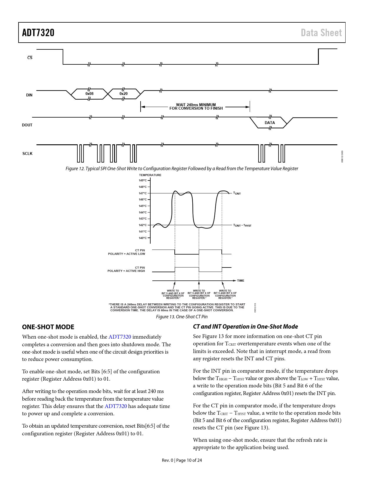 When one-shot mode is enabled, the ADT7320 immediately See Figure 13 for more information on one-shot CT pin completes a conversion and then goes into shutdown mode. The operation for TCRIT overtemperature events when one of the one-shot mode is useful when one of the circuit design priorities is limits is exceeded. Note that in interrupt mode, a read from to reduce power consumption. any register resets the INT and CT pins. To enable one-shot mode, set Bits [6:5] of the configuration For the INT pin in comparator mode, if the temperature drops register (Register Address 0x01) to 01. below the THIGH − THYST value or goes above the TLOW + THYST value, a write to the operation mode bits (Bit 5 and Bit 6 of the After writing to the operation mode bits, wait for at least 240 ms configuration register, Register Address 0x01) resets the INT pin. before reading back the temperature from the temperature value register. This delay ensures that the ADT7320 has adequate time For the CT pin in comparator mode, if the temperature drops to power up and complete a conversion. below the TCRIT − THYST value, a write to the operation mode bits (Bit 5 and Bit 6 of the configuration register, Register Address 0x01) To obtain an updated temperature conversion, reset Bits[6:5] of the resets the CT pin (see Figure 13). configuration register (Register Address 0x01) to 01. When using one-shot mode, ensure that the refresh rate is appropriate to the application being used. Rev. 0 | Page 10 of 24 Document Outline FEATURES APPLICATIONS GENERAL DESCRIPTION PRODUCT HIGHLIGHTS FUNCTIONAL BLOCK DIAGRAM TABLE OF CONTENTS REVISION HISTORY SPECIFICATIONS SPI TIMING SPECIFICATIONS ABSOLUTE MAXIMUM RATINGS ESD CAUTION PIN CONFIGURATION AND FUNCTION DESCRIPTIONS TYPICAL PERFORMANCE CHARACTERISTICS THEORY OF OPERATION CIRCUIT INFORMATION CONVERTER DETAILS CONTINUOUS CONVERSION MODE ONE-SHOT MODE CT and INT Operation in One-Shot Mode 1 SPS MODE SHUTDOWN MODE FAULT QUEUE TEMPERATURE DATA FORMAT TEMPERATURE CONVERSION FORMULAS 16-Bit Temperature Data Format 13-Bit Temperature Data Format 10-Bit Temperature Data Format 9-Bit Temperature Data Format REGISTERS STATUS REGISTER CONFIGURATION REGISTER TEMPERATURE VALUE REGISTER ID REGISTER TCRIT SETPOINT REGISTER THYST SETPOINT REGISTER THIGH SETPOINT REGISTER TLOW SETPOINT REGISTER SERIAL INTERFACE SPI COMMAND BYTE WRITING DATA READING DATA INTERFACING TO DSPs OR MICROCONTROLLERS SERIAL INTERFACE RESET INT AND CT OUTPUTS UNDERTEMPERATURE AND OVERTEMPERATURE DETECTION Comparator Mode Interrupt Mode APPLICATIONS INFORMATION THERMAL RESPONSE TIME SUPPLY DECOUPLING POWERING FROM A SWITCHING REGULATOR TEMPERATURE MEASUREMENT QUICK GUIDE TO MEASURING TEMPERATURE OUTLINE DIMENSIONS ORDERING GUIDE