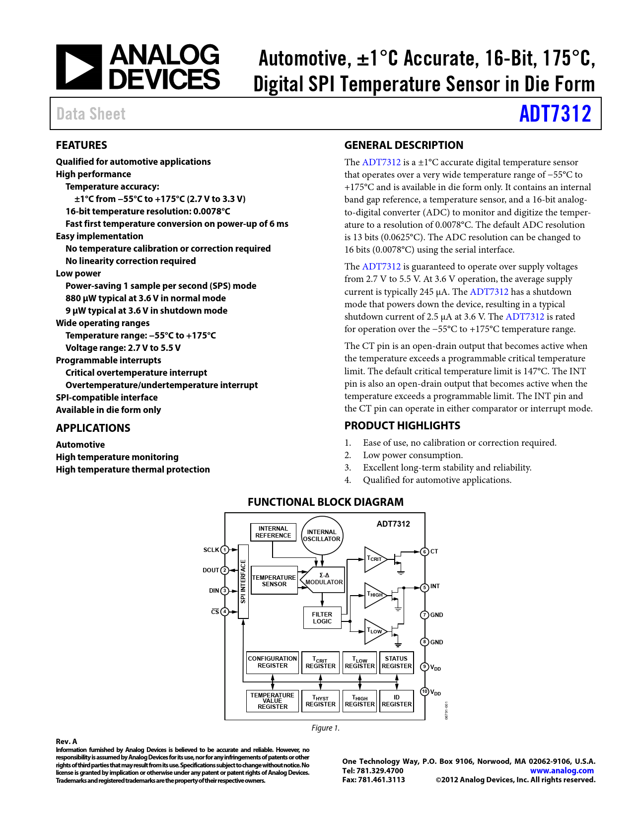 Automotive, ±1°C Accurate, 16-Bit, 175°C,. Digital SPI Temperature Sensor in Die Form. Data Sheet. ADT7312. FEATURES