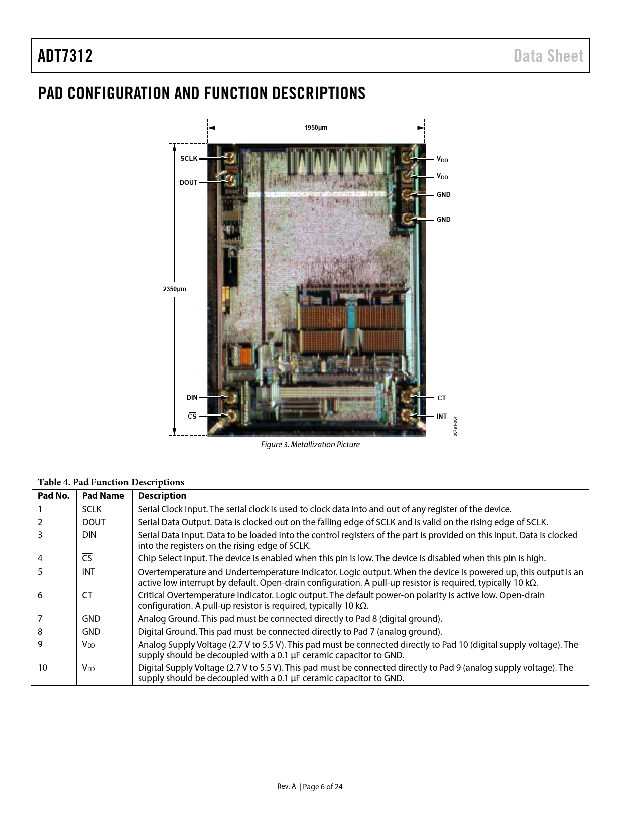 ADT7312Data SheetPAD CONFIGURATION AND FUNCTION DESCRIPTIONS1950µmSCLKVDDVDDDOUTGNDGND2350µmDINCTCSINT 004 1- 79 06 Figure 3. Metallization Picture Table 4. Pad Function Descriptions Pad No.Pad NameDescription 1 SCLK Serial Clock Input. The serial clock is used to clock data into and out of any register of the device. 2 DOUT Serial Data Output. Data is clocked out on the falling edge of SCLK and is valid on the rising edge of SCLK. 3 DIN Serial Data Input. Data to be loaded into the control registers of the part is provided on this input. Data is clocked into the registers on the rising edge of SCLK. 4 CS Chip Select Input. The device is enabled when this pin is low. The device is disabled when this pin is high. 5 INT Overtemperature and Undertemperature Indicator. Logic output. When the device is powered up, this output is an active low interrupt by default. Open-drain configuration. A pull-up resistor is required, typically 10 kΩ. 6 CT Critical Overtemperature Indicator. Logic output. The default power-on polarity is active low. Open-drain configuration. A pull-up resistor is required, typically 10 kΩ. 7 GND Analog Ground. This pad must be connected directly to Pad 8 (digital ground). 8 GND Digital Ground. This pad must be connected directly to Pad 7 (analog ground). 9 VDD Analog Supply Voltage (2.7 V to 5.5 V). This pad must be connected directly to Pad 10 (digital supply voltage). The supply should be decoupled with a 0.1 μF ceramic capacitor to GND. 10 VDD Digital Supply Voltage (2.7 V to 5.5 V). This pad must be connected directly to Pad 9 (analog supply voltage). The supply should be decoupled with a 0.1 μF ceramic capacitor to GND. Rev. A | Page 6 of 24 Document Outline Features Applications General Description Product Highlights Functional Block Diagram Table of Contents Revision History Specifications SPI Timing Specifications Absolute Maximum Ratings ESD Caution Pad Configuration and Function Descriptions Die Bond Pad Coordinates Typical Performance Characteristics Theory of Operation Circuit Description Converter Architecture Normal Mode (Continuous Conversion Mode) One-Shot Mode CT and INT Operation in One-Shot Mode 1 SPS Mode Shutdown Mode Fault Queue Temperature Data Format Temperature Conversion Formulas 16-Bit Temperature Data Format 13-Bit Temperature Data Format 10-Bit Temperature Data Format 9-Bit Temperature Data Format Registers Status Register Configuration Register Temperature Value Register ID Register TCRIT Setpoint Register THYST Setpoint Register THIGH Setpoint Register TLOW Setpoint Register Serial Interface SPI Command Byte Writing Data Reading Data Interfacing to DSPs or Microcontrollers Resetting the Serial Interface INT and CT Outputs Undertemperature and Overtemperature Detection Comparator Mode Interrupt Mode Redundant Critical Generator Applications Information Thermal Response Time Supply Decoupling Powering from a Switching Regulator Temperature Monitoring Quick Guide to Measuring Temperature Outline Dimensions Ordering Guide Automotive Products