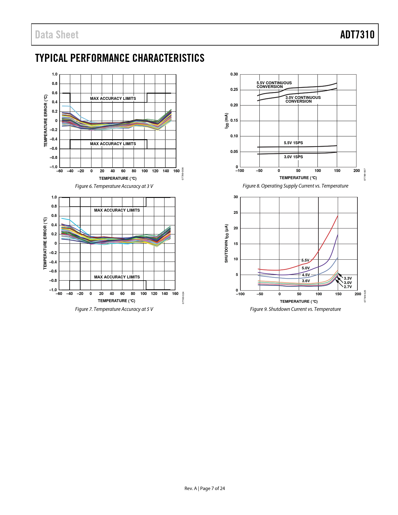 Data SheetADT7310TYPICAL PERFORMANCE CHARACTERISTICS1.00.300.85.5V CONTINUOUS CONVERSION0.250.6°C)MAX ACCURACY LIMITS3.0V CONTINUOUS0.4CONVERSIONR (0.20RRO0.2EA)0m 0.15(URE TI DDA –0.20.10–0.4EMPERMAX ACCURACY LIMITS5.5V 1SPST –0.60.05–0.83.0V 1SPS–1.00 006 –60–40–20020406080100120140160–100–50050100150200 007 TEMPERATURE (°C) 07789- TEMPERATURE (°C) 07789- Figure 6. Temperature Accuracy at 3 V Figure 8. Operating Supply Current vs. Temperature 1.0300.8MAX ACCURACY LIMITS250.6°C)0.4R (A) µ20(0.2RRODDEN I0W15URE T A –0.2DOHUT10–0.4S5.5VEMPER T5.0V–0.654.5VMAX ACCURACY LIMITS3.3V–0.83.6V3.0V 2.7V–1.00–60–40–20020406080100120140160 025 024 –100–50050100150200TEMPERATURE (°C)TEMPERATURE (°C) 07789- 07789- Figure 7. Temperature Accuracy at 5 V Figure 9. Shutdown Current vs. Temperature Rev. A | Page 7 of 24 Document Outline Features Applications General Description Functional Block Diagram Revision History Specifications SPI Timing Specifications Absolute Maximum Ratings ESD Caution Pin Configuration and Function Descriptions Typical Performance Characteristics Theory of Operation Circuit Information Converter Details Temperature Measurement One-Shot Mode 1 SPS Mode CT and INT Operation in One-Shot Mode Continuous Read Mode Shutdown Fault Queue Temperature Data Format Temperature Conversion Formulas 16-Bit Temperature Data Format 13-Bit Temperature Data Format 10-Bit Temperature Data Format 9-Bit Temperature Data Format Registers Status Register Configuration Register Temperature Value Register ID Register TCRIT Setpoint Register THYST Setpoint Register THIGH Setpoint Register TLOW Setpoint Register Serial Interface SPI Command Byte Writing Data Reading Data Interfacing to DSPs or Microcontrollers Serial Interface Reset INT and CT Outputs Undertemperature and Overtemperature Detection Comparator Mode Interrupt Mode Applications Information Thermal Response Time Supply Decoupling Temperature Monitoring Outline Dimensions Ordering Guide