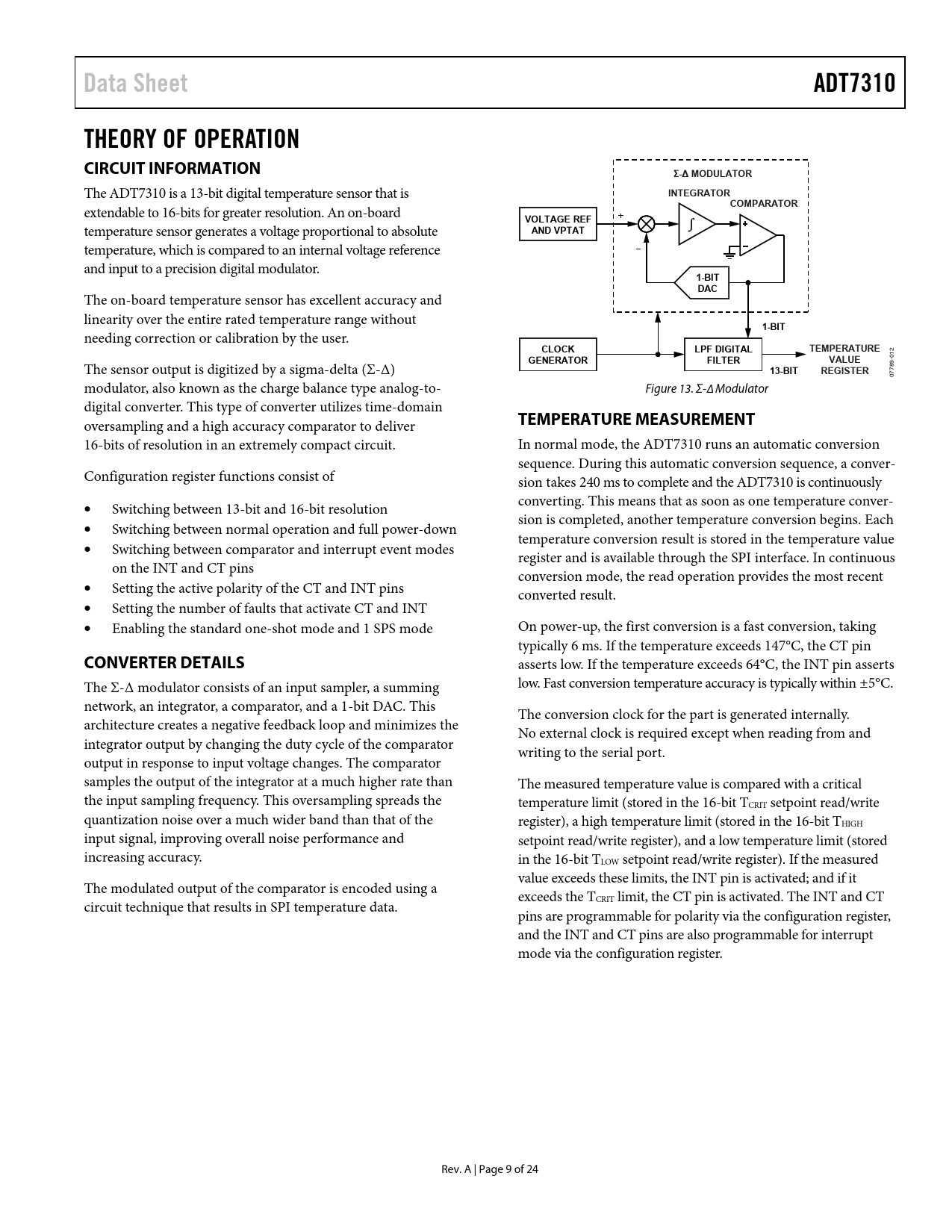 Data SheetADT7310THEORY OF OPERATION CIRCUIT INFORMATIONΣ-∆ MODULATOR The ADT7310 is a 13-bit digital temperature sensor that is INTEGRATORCOMPARATOR extendable to 16-bits for greater resolution. An on-board VOLTAGE REF temperature sensor generates a voltage proportional to absolute AND VPTAT temperature, which is compared to an internal voltage reference and input to a precision digital modulator. 1-BITDAC The on-board temperature sensor has excellent accuracy and linearity over the entire rated temperature range without 1-BIT needing correction or calibration by the user. CLOCKLPF DIGITALTEMPERATURE 12 GENERATORFILTERVALUE -0 The sensor output is digitized by a sigma-delta (Σ-Δ) 13-BITREGISTER 789 7 0 modulator, also known as the charge balance type analog-to- Figure 13. Σ-∆ Modulator digital converter. This type of converter utilizes time-domain oversampling and a high accuracy comparator to deliver TEMPERATURE MEASUREMENT 16-bits of resolution in an extremely compact circuit. In normal mode, the ADT7310 runs an automatic conversion sequence. During this automatic conversion sequence, a conver- Configuration register functions consist of sion takes 240 ms to complete and the ADT7310 is continuously converting. This means that as soon as one temperature conver- Switching between 13-bit and 16-bit resolution sion is completed, another temperature conversion begins. Each Switching between normal operation and full power-down temperature conversion result is stored in the temperature value Switching between comparator and interrupt event modes register and is available through the SPI interface. In continuous on the INT and CT pins conversion mode, the read operation provides the most recent Setting the active polarity of the CT and INT pins converted result. Setting the number of faults that activate CT and INT Enabling the standard one-shot mode and 1 SPS mode On power-up, the first conversion is a fast conversion, taking typically 6 ms. If the temperature exceeds 147°C, the CT pin CONVERTER DETAILS asserts low. If the temperature exceeds 64°C, the INT pin asserts The Σ-Δ modulator consists of an input sampler, a summing low. Fast conversion temperature accuracy is typically within ±5°C. network, an integrator, a comparator, and a 1-bit DAC. This The conversion clock for the part is generated internally. architecture creates a negative feedback loop and minimizes the No external clock is required except when reading from and integrator output by changing the duty cycle of the comparator writing to the serial port. output in response to input voltage changes. The comparator samples the output of the integrator at a much higher rate than The measured temperature value is compared with a critical the input sampling frequency. This oversampling spreads the temperature limit (stored in the 16-bit TCRIT setpoint read/write quantization noise over a much wider band than that of the register), a high temperature limit (stored in the 16-bit THIGH input signal, improving overall noise performance and setpoint read/write register), and a low temperature limit (stored increasing accuracy. in the 16-bit TLOW setpoint read/write register). If the measured value exceeds these limits, the INT pin is activated; and if it The modulated output of the comparator is encoded using a exceeds the TCRIT limit, the CT pin is activated. The INT and CT circuit technique that results in SPI temperature data. pins are programmable for polarity via the configuration register, and the INT and CT pins are also programmable for interrupt mode via the configuration register. Rev. A | Page 9 of 24 Document Outline Features Applications General Description Functional Block Diagram Revision History Specifications SPI Timing Specifications Absolute Maximum Ratings ESD Caution Pin Configuration and Function Descriptions Typical Performance Characteristics Theory of Operation Circuit Information Converter Details Temperature Measurement One-Shot Mode 1 SPS Mode CT and INT Operation in One-Shot Mode Continuous Read Mode Shutdown Fault Queue Temperature Data Format Temperature Conversion Formulas 16-Bit Temperature Data Format 13-Bit Temperature Data Format 10-Bit Temperature Data Format 9-Bit Temperature Data Format Registers Status Register Configuration Register Temperature Value Register ID Register TCRIT Setpoint Register THYST Setpoint Register THIGH Setpoint Register TLOW Setpoint Register Serial Interface SPI Command Byte Writing Data Reading Data Interfacing to DSPs or Microcontrollers Serial Interface Reset INT and CT Outputs Undertemperature and Overtemperature Detection Comparator Mode Interrupt Mode Applications Information Thermal Response Time Supply Decoupling Temperature Monitoring Outline Dimensions Ordering Guide