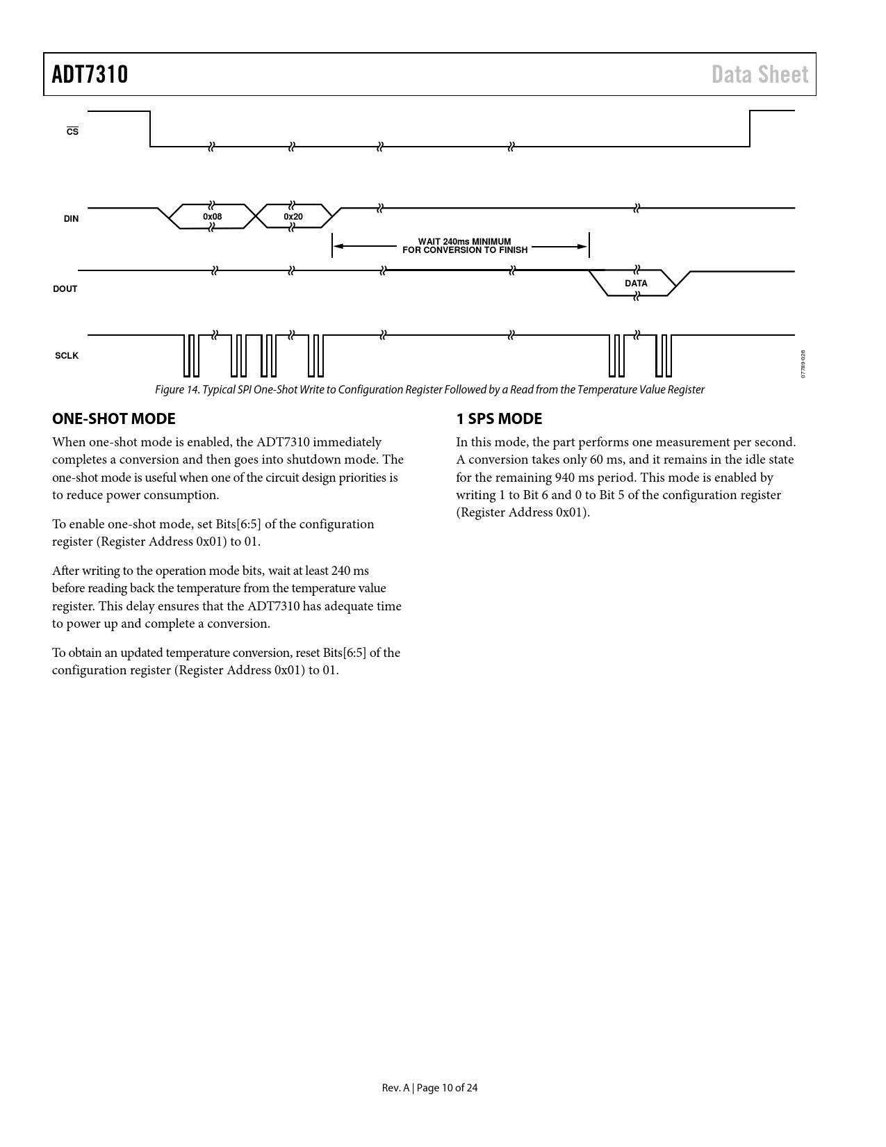 ADT7310. Data Sheet. DIN. 0x08. 0x20. WAIT 240ms MINIMUM. FOR CONVERSION TO FINISH. DATA. DOUT. SCLK. ONE-SHOT MODE. 1 SPS MODE
