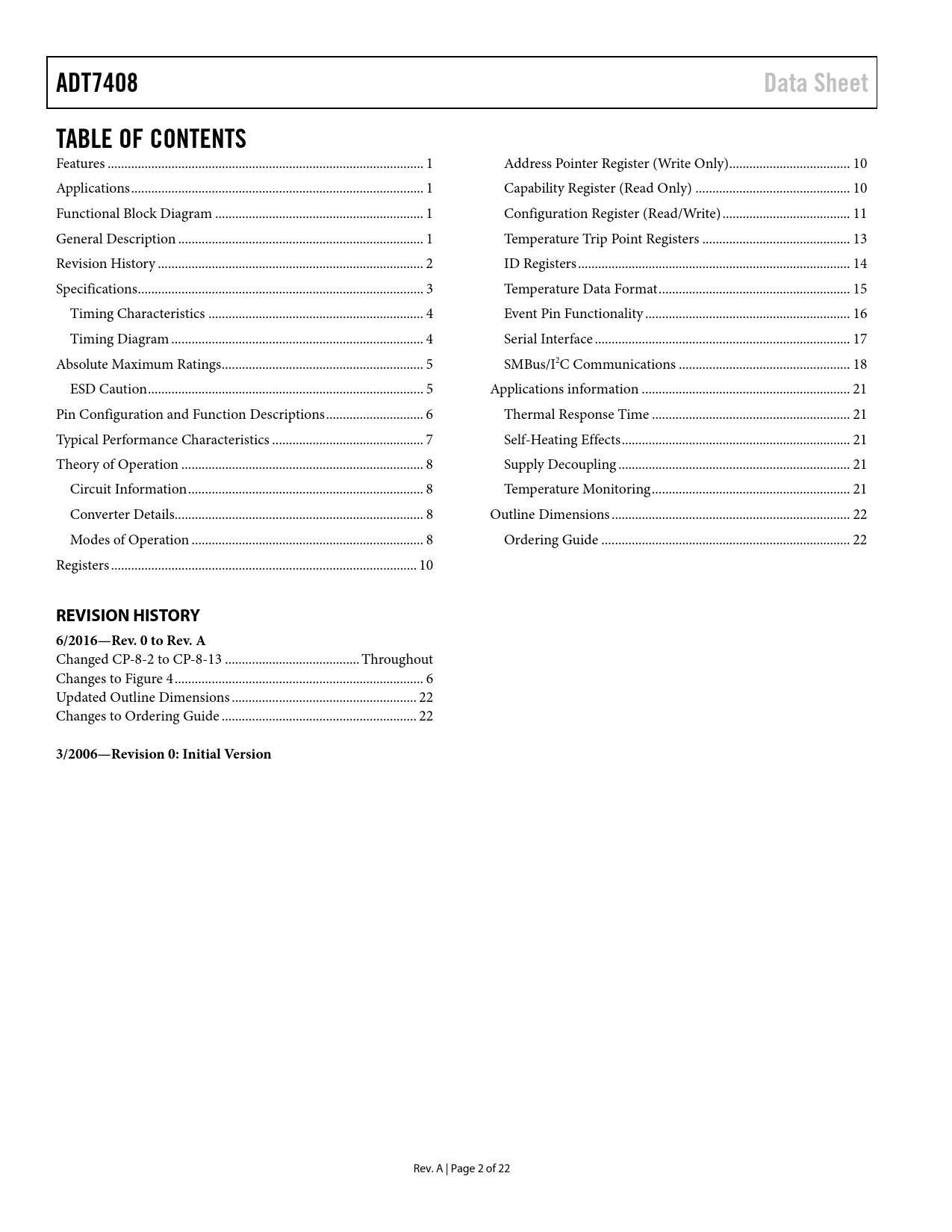 Pages / Page22 / 2 — ADT7408. Data Sheet. TABLE OF CONTENTS. REVISION HISTORY 6/2016—Rev. 0 to …