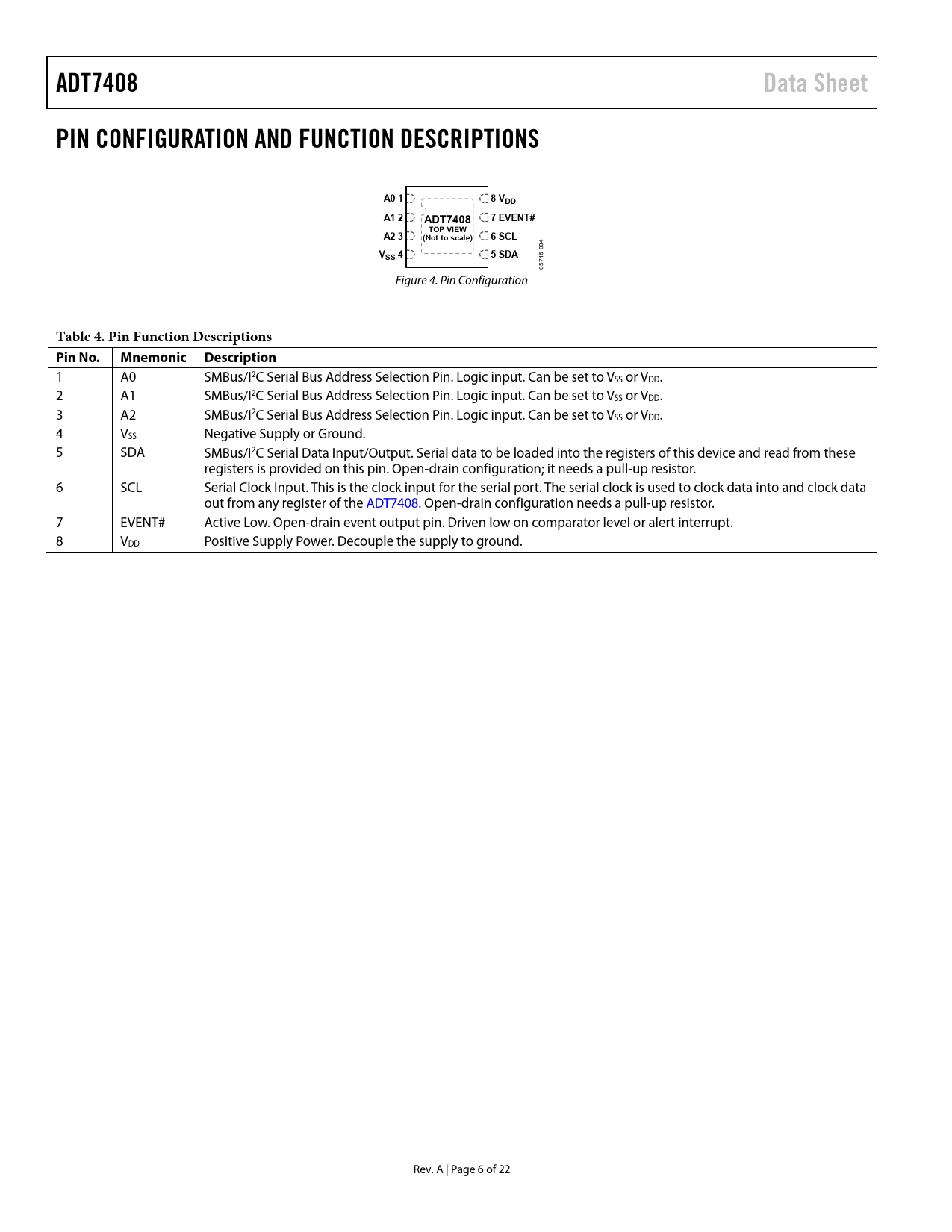 Pages / Page22 / 6 — ADT7408. Data Sheet. PIN CONFIGURATION AND FUNCTION DESCRIPTIONS. A0 1. 8 …