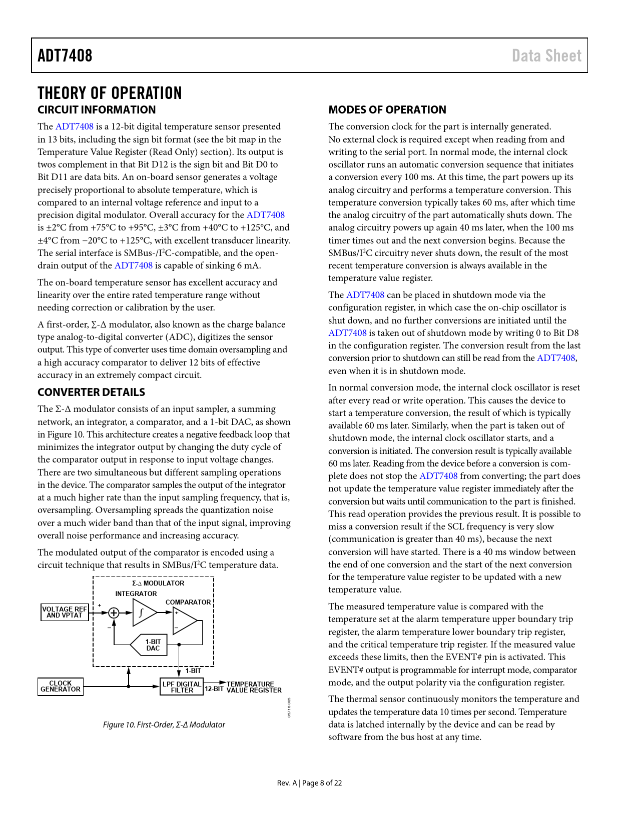 link to page 13 link to page 8 ADT7408Data SheetTHEORY OF OPERATION CIRCUIT INFORMATIONMODES OF OPERATION The ADT7408 is a 12-bit digital temperature sensor presented The conversion clock for the part is internally generated. in 13 bits, including the sign bit format (see the bit map in the No external clock is required except when reading from and Temperature Value Register (Read Only) section). Its output is writing to the serial port. In normal mode, the internal clock twos complement in that Bit D12 is the sign bit and Bit D0 to oscillator runs an automatic conversion sequence that initiates Bit D11 are data bits. An on-board sensor generates a voltage a conversion every 100 ms. At this time, the part powers up its precisely proportional to absolute temperature, which is analog circuitry and performs a temperature conversion. This compared to an internal voltage reference and input to a temperature conversion typically takes 60 ms, after which time precision digital modulator. Overall accuracy for the ADT7408 the analog circuitry of the part automatically shuts down. The is ±2°C from +75°C to +95°C, ±3°C from +40°C to +125°C, and analog circuitry powers up again 40 ms later, when the 100 ms ±4°C from −20°C to +125°C, with excellent transducer linearity. timer times out and the next conversion begins. Because the The serial interface is SMBus-/I2C-compatible, and the open- SMBus/I2C circuitry never shuts down, the result of the most drain output of the ADT7408 is capable of sinking 6 mA. recent temperature conversion is always available in the The on-board temperature sensor has excellent accuracy and temperature value register. linearity over the entire rated temperature range without The ADT7408 can be placed in shutdown mode via the needing correction or calibration by the user. configuration register, in which case the on-chip oscillator is A first-order, ∑-Δ modulator, also known as the charge balance shut down, and no further conversions are initiated until the type analog-to-digital converter (ADC), digitizes the sensor ADT7408 is taken out of shutdown mode by writing 0 to Bit D8 output. This type of converter uses time domain oversampling and in the configuration register. The conversion result from the last a high accuracy comparator to deliver 12 bits of effective conversion prior to shutdown can still be read from the ADT7408, accuracy in an extremely compact circuit. even when it is in shutdown mode. CONVERTER DETAILS In normal conversion mode, the internal clock oscillator is reset after every read or write operation. This causes the device to The Σ-Δ modulator consists of an input sampler, a summing start a temperature conversion, the result of which is typically network, an integrator, a comparator, and a 1-bit DAC, as shown available 60 ms later. Similarly, when the part is taken out of in Figure 10. This architecture creates a negative feedback loop that shutdown mode, the internal clock oscillator starts, and a minimizes the integrator output by changing the duty cycle of conversion is initiated. The conversion result is typically available the comparator output in response to input voltage changes. 60 ms later. Reading from the device before a conversion is com- There are two simultaneous but different sampling operations plete does not stop the ADT7408 from converting; the part does in the device. The comparator samples the output of the integrator not update the temperature value register immediately after the at a much higher rate than the input sampling frequency, that is, conversion but waits until communication to the part is finished. oversampling. Oversampling spreads the quantization noise This read operation provides the previous result. It is possible to over a much wider band than that of the input signal, improving miss a conversion result if the SCL frequency is very slow overall noise performance and increasing accuracy. (communication is greater than 40 ms), because the next The modulated output of the comparator is encoded using a conversion will have started. There is a 40 ms window between circuit technique that results in SMBus/I2C temperature data. the end of one conversion and the start of the next conversion for the temperature value register to be updated with a new Σ-∆ MODULATORINTEGRATOR temperature value. COMPARATOR+VOLTAGE REF The measured temperature value is compared with the AND VPTAT+ temperature set at the alarm temperature upper boundary trip –– register, the alarm temperature lower boundary trip register, 1-BITDAC and the critical temperature trip register. If the measured value exceeds these limits, then the EVENT# pin is activated. This 1-BIT EVENT# output is programmable for interrupt mode, comparator CLOCKLPF DIGITALTEMPERATURE mode, and the output polarity via the configuration register. GENERATORFILTER12-BIT VALUE REGISTER 05 The thermal sensor continuously monitors the temperature and 0 6- 571 updates the temperature data 10 times per second. Temperature 0 Figure 10. First-Order, Σ-Δ Modulator data is latched internally by the device and can be read by software from the bus host at any time. Rev. A | Page 8 of 22 Document Outline FEATURES APPLICATIONS FUNCTIONAL BLOCK DIAGRAM GENERAL DESCRIPTION TABLE OF CONTENTS REVISION HISTORY SPECIFICATIONS TIMING CHARACTERISTICS TIMING DIAGRAM ABSOLUTE MAXIMUM RATINGS ESD CAUTION PIN CONFIGURATION AND FUNCTION DESCRIPTIONS TYPICAL PERFORMANCE CHARACTERISTICS THEORY OF OPERATION CIRCUIT INFORMATION CONVERTER DETAILS MODES OF OPERATION REGISTERS ADDRESS POINTER REGISTER (WRITE ONLY) CAPABILITY REGISTER (READ ONLY) CONFIGURATION REGISTER (READ/WRITE) TEMPERATURE TRIP POINT REGISTERS Alarm Temperature Upper Boundary Trip Register (Read/Write) Alarm Temperature Lower Boundary Trip Register (Read/Write) Critical Temperature Trip Register (Read/Write) Temperature Value Register (Read Only) ID REGISTERS Manufacturer ID Register (Read Only) Device ID and Revision Regi