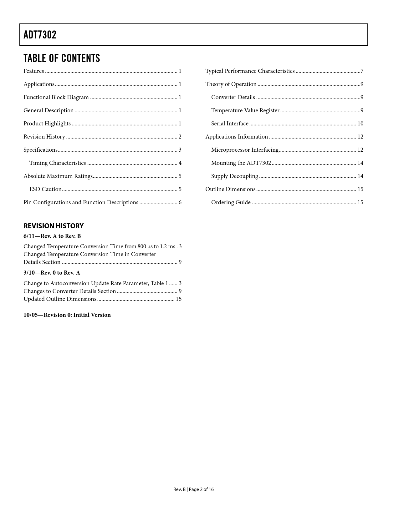 Pages / Page16 / 2 — ADT7302. TABLE OF CONTENTS. REVISION HISTORY 6/11—Rev. A to Rev. B. …