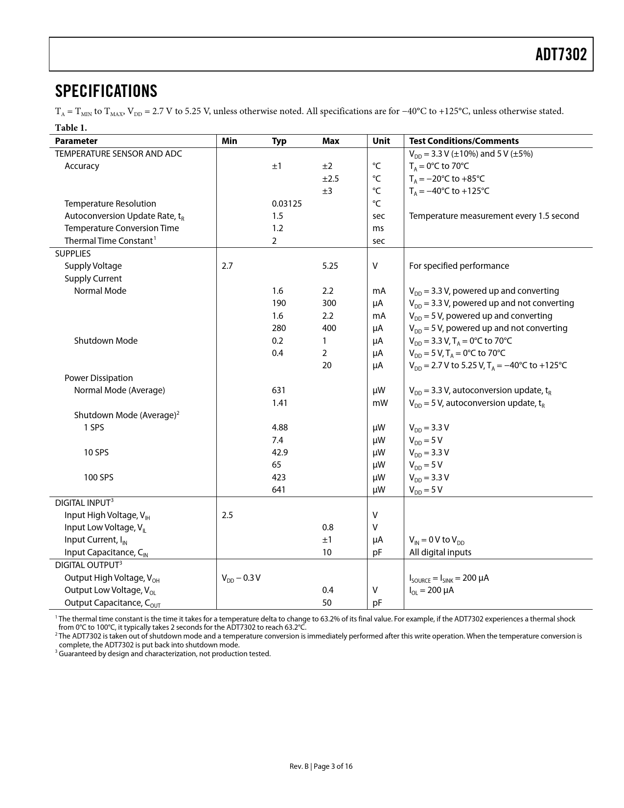 Pages / Page16 / 3 — ADT7302. SPECIFICATIONS. Table 1. Parameter. Min. Typ. Max. Unit. Test …