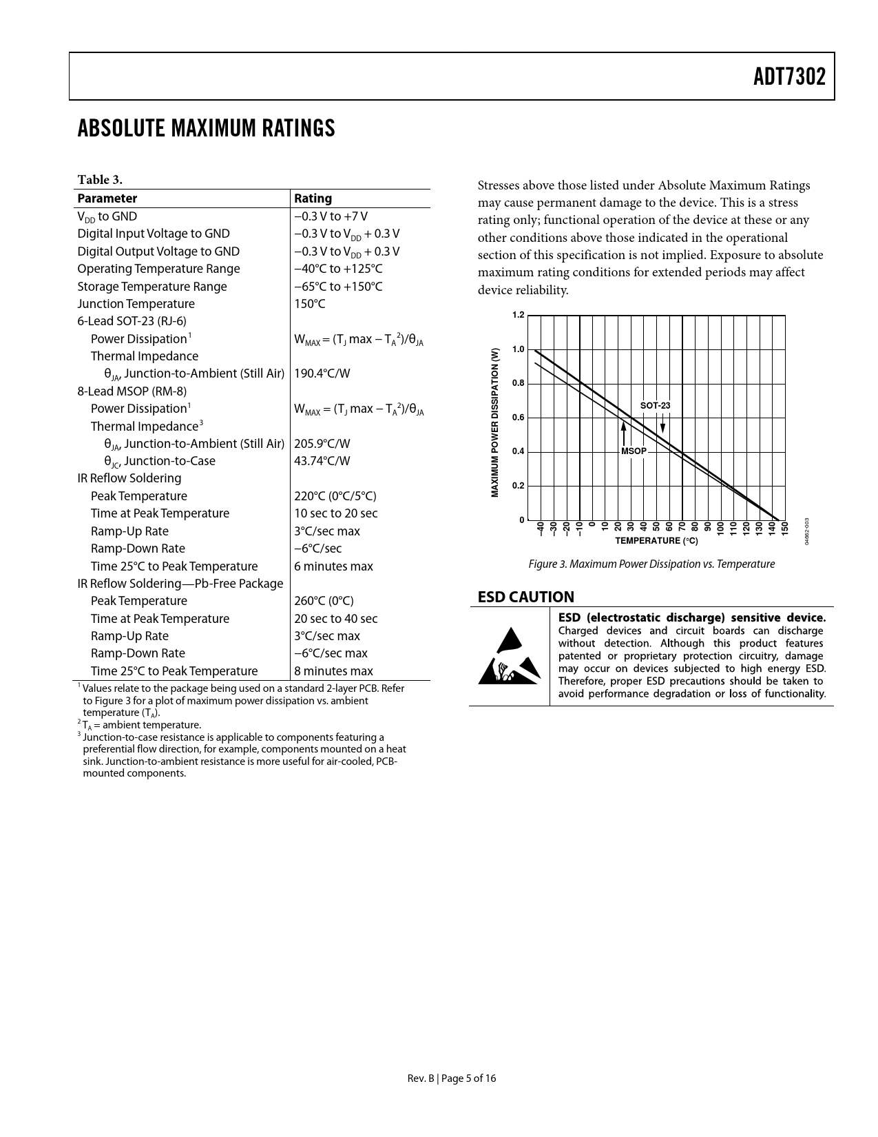 ADT7302. ABSOLUTE MAXIMUM RATINGS. Table 3. Parameter. Rating. 1.2. 1.0. 0.8. SOT-23. 0.6. 0.4. MSOP. 0.2. MAXIMUM POWER DISSIPATION (W). 100. 110. 120