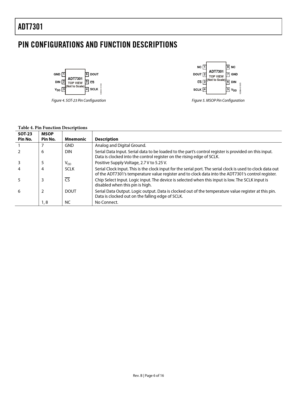 ADT7301. PIN CONFIGURATIONS AND FUNCTION DESCRIPTIONS. NC 1. 8 NC. GND 1. 6 DOUT. DOUT 2. 7 GND. TOP VIEW. (Not to Scale). DIN 2. CS 3. 6 DIN