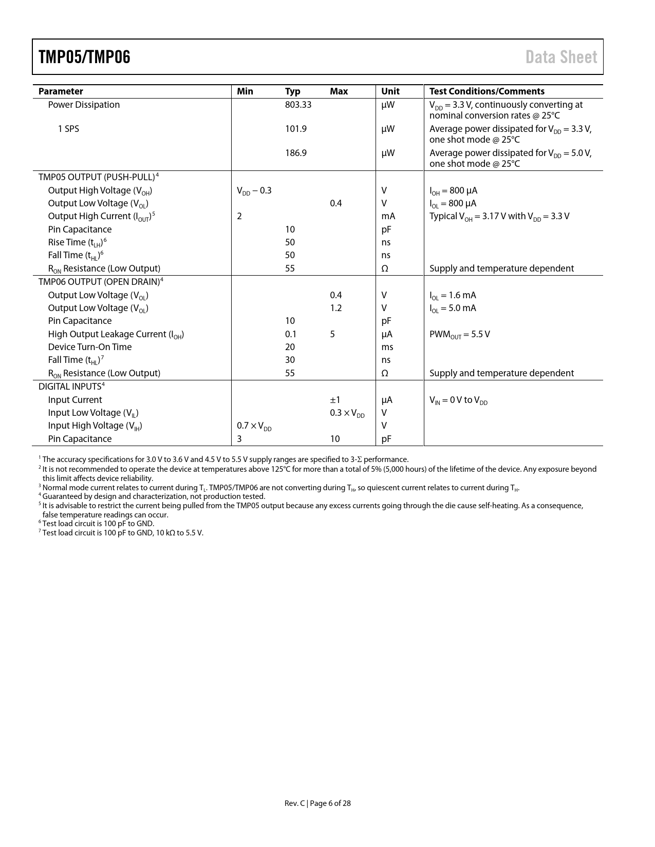 Pages / Page28 / 6 — TMP05/TMP06. Data Sheet. Parameter. Min. Typ. Max. Unit. Test …