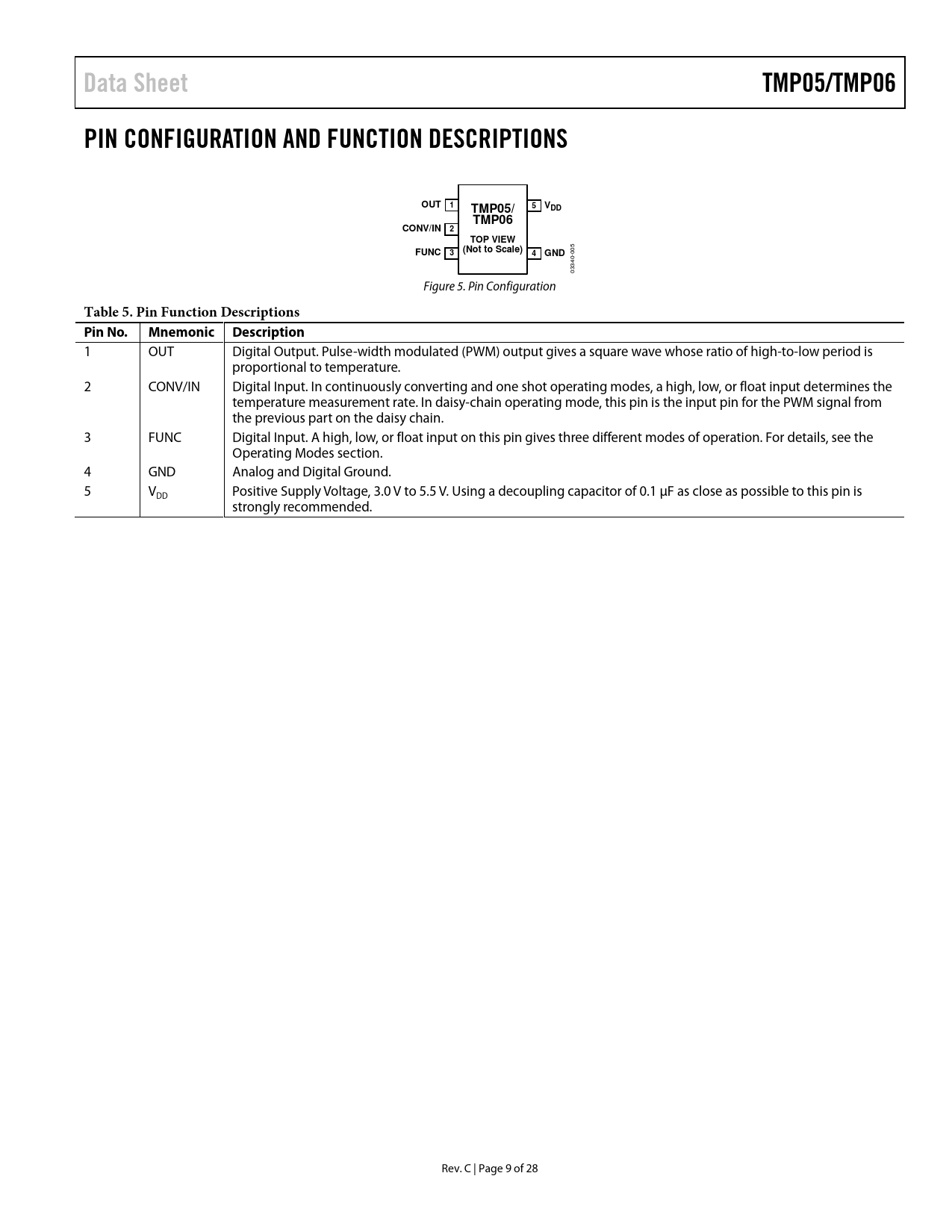 link to page 13 Data SheetTMP05/TMP06PIN CONFIGURATION AND FUNCTION DESCRIPTIONSOUT15VDDTMP05/TMP06CONV/IN2TOP VIEWFUNC3(Not to Scale)4GND 005 03340- Figure 5. Pin Configuration Table 5. Pin Function Descriptions Pin No.Mnemonic Description 1 OUT Digital Output. Pulse-width modulated (PWM) output gives a square wave whose ratio of high-to-low period is proportional to temperature. 2 CONV/IN Digital Input. In continuously converting and one shot operating modes, a high, low, or float input determines the temperature measurement rate. In daisy-chain operating mode, this pin is the input pin for the PWM signal from the previous part on the daisy chain. 3 FUNC Digital Input. A high, low, or float input on this pin gives three different modes of operation. For details, see the Operating Modes section. 4 GND Analog and Digital Ground. 5 V Positive Supply Voltage, 3.0 V to 5.5 V. Using a decoupling capacitor of 0.1 µF as close as possible to this pin is DD strongly recommended. Rev. C | Page 9 of 28 Document Outline Features Applications Functional Block Diagram General Description Product Highlights Revision History Specifications TMP05A/TMP06A Specifications TMP05B/TMP06B Specifications Timing Characteristics Absolute Maximum Ratings ESD Caution Pin Configuration and Function Descriptions Typical Performance Characteristics Theory of Operation Circuit Information Converter Details Functional Description Operating Modes Continuously Converting Mode One Shot Mode Conversion Rate Daisy-Chain Mode TMP05 Output TMP06 Output Application Hints Thermal Response Time Self-Heating Effects Supply Decoupling Layout Considerations Temperature Monitoring Daisy-Chain Application TMP05 Program Code Example 1 Continuously Converting Application TMP05 Program Code Example 2 Outline Dimensions Ordering Guide