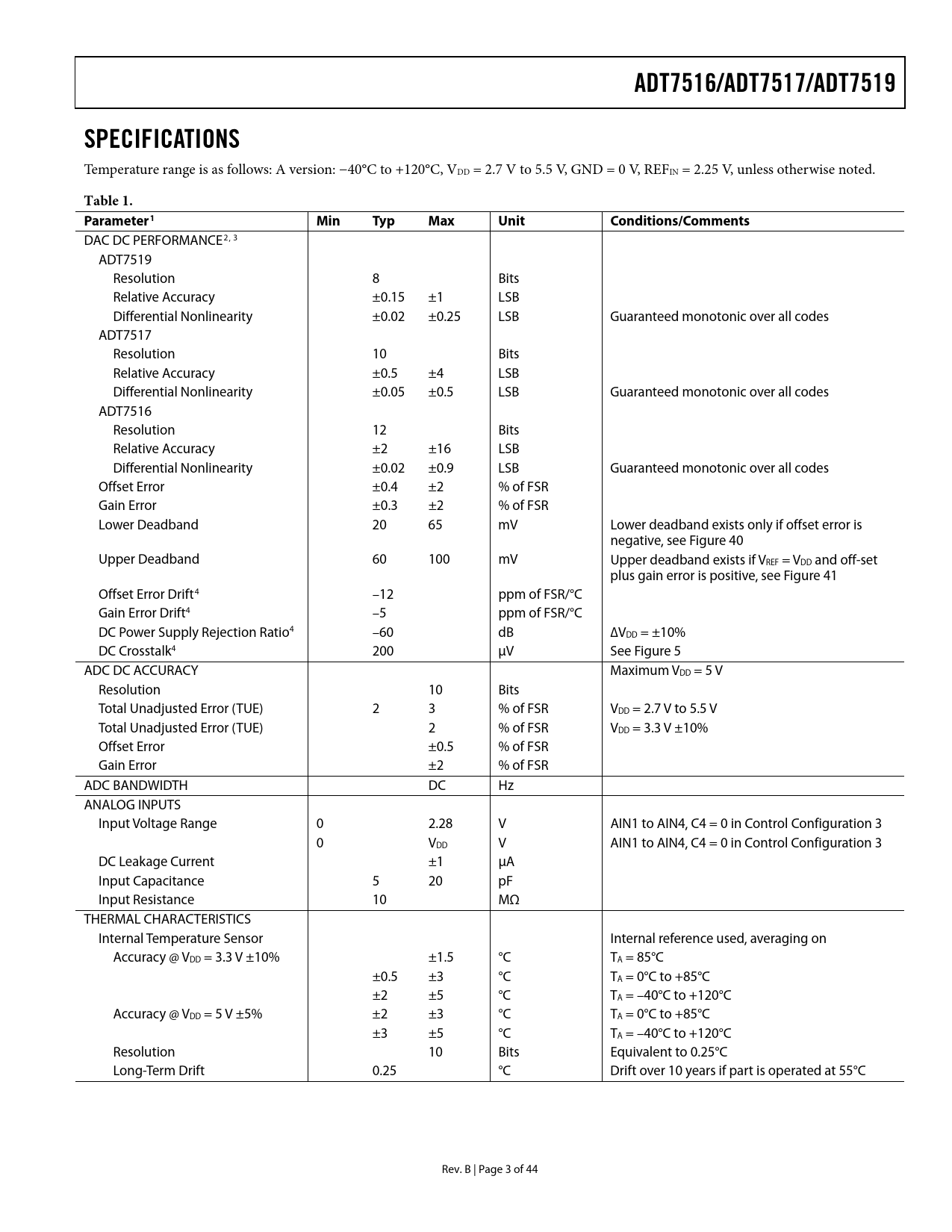 | Pages / Page | 44 / 3 — ADT7516/ADT7517/ADT7519. SPECIFICATIONS. Table 1. Parameter1. Min. Typ. … |