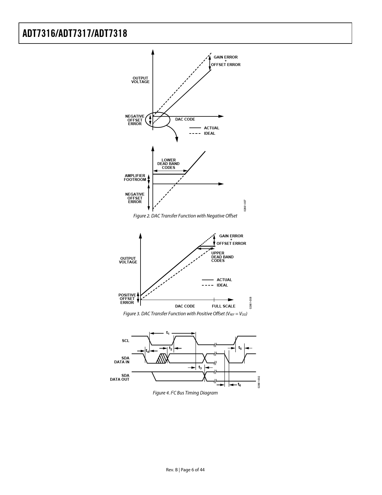 ADT7316/ADT7317/ADT7318GAIN ERROR+OFFSET ERROROUTPUTVOLTAGENEGATIVEOFFSETDAC CODEERRORACTUAL IDEALLOWERDEAD BANDCODESAMPLIFIERFOOTROOMNEGATIVEOFFSETERROR 7 1-00 66 02 Figure 2. DAC Transfer Function with Negative Offset GAIN ERROR+OFFSET ERRORUPPERDEAD BANDOUTPUTCODESVOLTAGEACTUAL IDEALPOSITIVEOFFSET 8 00 ERROR 1- DAC CODEFULL SCALE 266 0 Figure 3. DAC Transfer Function with Positive Offset (VREF = VDD) t1SCLttt254SDADATA INt3SDADATA OUT 02 -0 t6 661 02 Figure 4. I2C Bus Timing Diagram Rev. B | Page 6 of 44 Document Outline FEATURES APPLICATIONS PIN CONFIGURATION GENERAL DESCRIPTION TABLE OF CONTENTS REVISION HISTORY SPECIFICATIONS FUNCTIONAL BLOCK DIAGRAM DAC AC CHARACTERISTICS ABSOLUTE MAXIMUM RATINGS ESD CAUTION PIN CONFIGURATION AND FUNCTION DESCRIPTIONS TERMINOLOGY TYPICAL PERFORMANCE CHARACTERISTICS THEORY OF OPERATION POWER-UP CALIBRATION CONVERSION SPEED FUNCTIONAL DESCRIPTION—VOLTAGE OUTPUT DIGITAL-TO-ANALOG CONVERTERS DIGITAL-TO-ANALOG SECTION RESISTOR STRING DAC EXTERNAL REFERENCE INPUTS OUTPUT AMPLIFIER THERMAL VOLTAGE OUTPUT Negative Temperatures Positive Temperatures FUNCTIONAL DESCRIPTION—MEASUREMENT TEMPERATURE SENSOR VDD MONITORING ON-CHIP REFERENCE ROUND ROBIN MEASUREMENT SINGLE-CHANNEL MEASUREMENT TEMPERATURE MEASUREMENT METHOD Internal Temperature Measurement External Temperature Measurement TEMPERATURE VALUE FORMAT Temperature Conversion Formula INTERRUPTS REGISTERS REGISTER DESCRIPTIONS SERIAL INTERFACE SERIAL INTERFACE SELECTION I2C SERIAL INTERFACE Writing to the ADT7316/ADT7317/ADT7318 Writing to the Address Pointer Register for a Subsequent Read Writing Data to a Register Reading Data from the ADT7316/ADT7317/ADT7318 SPI SERIAL INTERFACE Write Operation Read Operation SMBUS/SPI INT/ SMBUS Alert Response LAYOUT CONSIDERATIONS OUTLINE DIMENSIONS ORDERING GUIDE