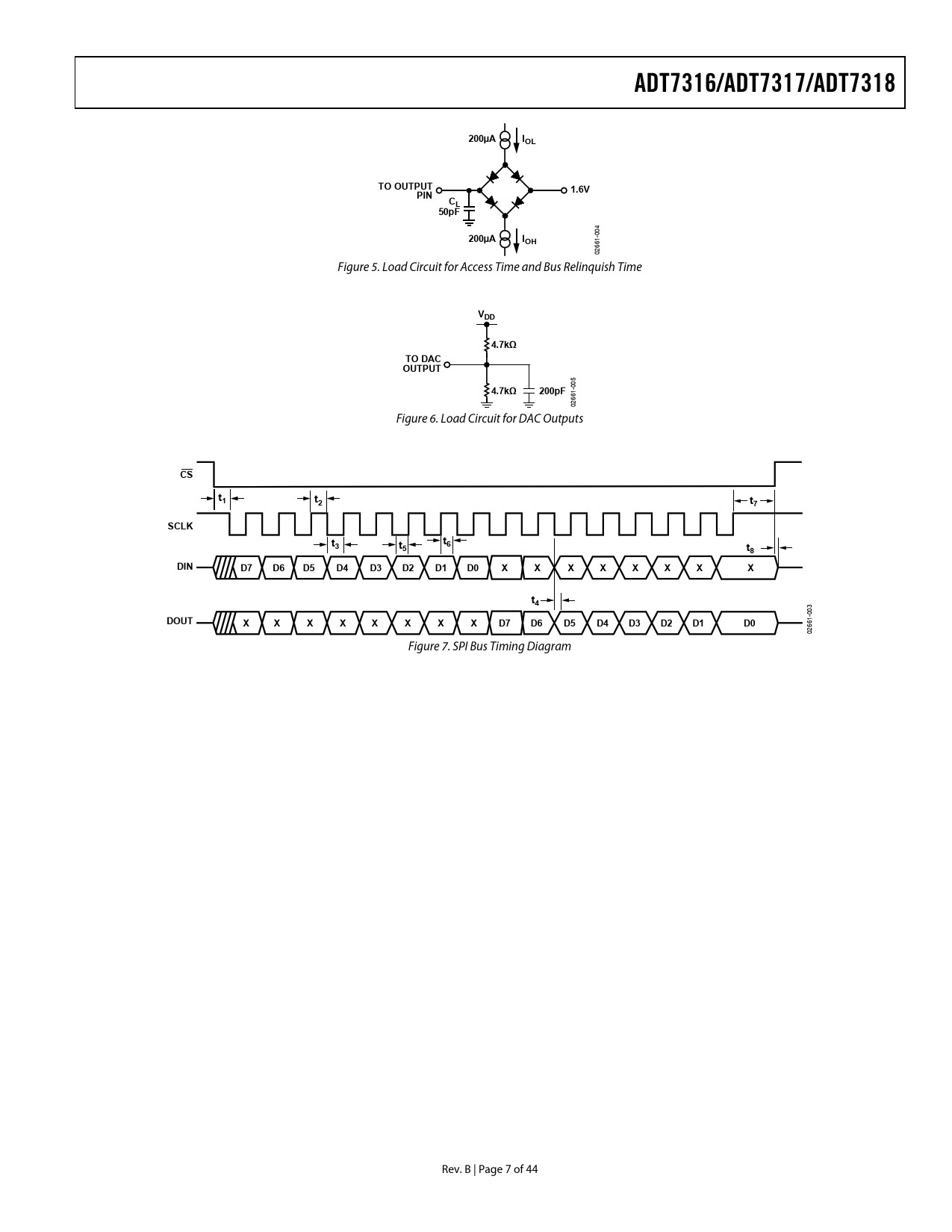 ADT7316/ADT7317/ADT7318200µAIOLTO OUTPUT1.6VPINCL50pF 04 0 200µAIOH 1- 66 02 Figure 5. Load Circuit for Access Time and Bus Relinquish Time VDD4.7kΩTO DACOUTPUT4.7kΩ 005 200pF 1- 266 0 Figure 6. Load Circuit for DAC Outputs CSt1t2t7SCLKtt3t65t8DIND7D6D5D4D3D2D1D0XXXXXXXXt4 -003 DOUTXXXXXXXXD7D6D5D4D3D2D1D0 661 02 Figure 7. SPI Bus Timing Diagram Rev. B | Page 7 of 44 Document Outline FEATURES APPLICATIONS PIN CONFIGURATION GENERAL DESCRIPTION TABLE OF CONTENTS REVISION HISTORY SPECIFICATIONS FUNCTIONAL BLOCK DIAGRAM DAC AC CHARACTERISTICS ABSOLUTE MAXIMUM RATINGS ESD CAUTION PIN CONFIGURATION AND FUNCTION DESCRIPTIONS TERMINOLOGY TYPICAL PERFORMANCE CHARACTERISTICS THEORY OF OPERATION POWER-UP CALIBRATION CONVERSION SPEED FUNCTIONAL DESCRIPTION—VOLTAGE OUTPUT DIGITAL-TO-ANALOG CONVERTERS DIGITAL-TO-ANALOG SECTION RESISTOR STRING DAC EXTERNAL REFERENCE INPUTS OUTPUT AMPLIFIER THERMAL VOLTAGE OUTPUT Negative Temperatures Positive Temperatures FUNCTIONAL DESCRIPTION—MEASUREMENT TEMPERATURE SENSOR VDD MONITORING ON-CHIP REFERENCE ROUND ROBIN MEASUREMENT SINGLE-CHANNEL MEASUREMENT TEMPERATURE MEASUREMENT METHOD Internal Temperature Measurement External Temperature Measurement TEMPERATURE VALUE FORMAT Temperature Conversion Formula INTERRUPTS REGISTERS REGISTER DESCRIPTIONS SERIAL INTERFACE SERIAL INTERFACE SELECTION I2C SERIAL INTERFACE Writing to the ADT7316/ADT7317/ADT7318 Writing to the Address Pointer Register for a Subsequent Read Writing Data to a Register Reading Data from the ADT7316/ADT7317/ADT7318 SPI SERIAL INTERFACE Write Operation Read Operation SMBUS/SPI INT/ SMBUS Alert Response LAYOUT CONSIDERATIONS OUTLINE DIMENSIONS ORDERING GUIDE