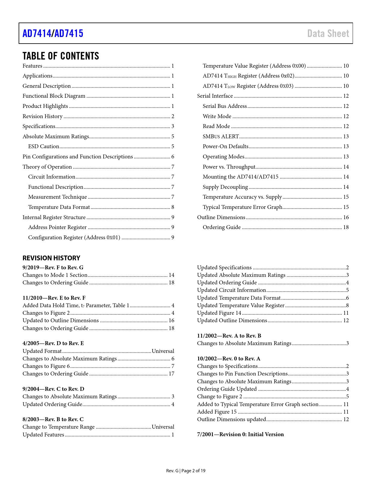 Pages / Page19 / 2 — AD7414/. AD7415. Data Sheet. TABLE OF CONTENTS. REVISION HISTORY. …