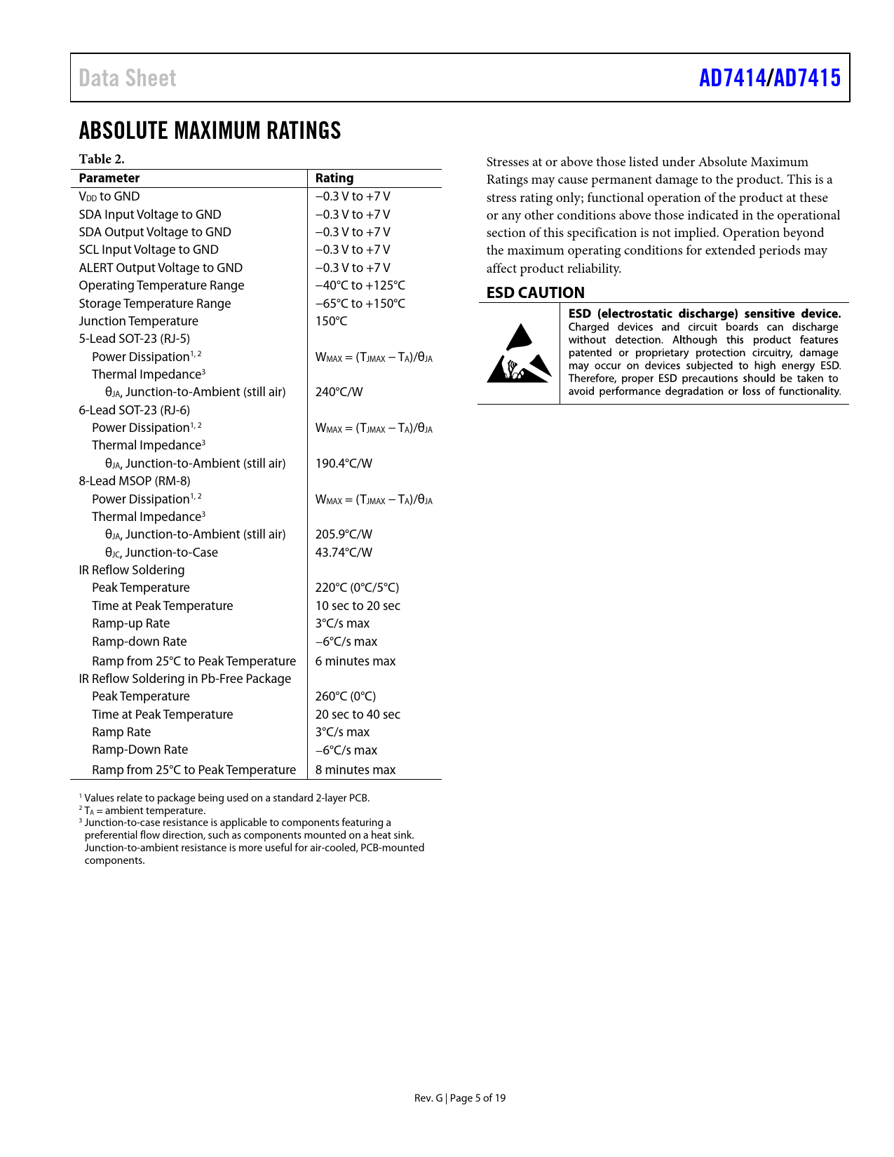 Data Sheet. AD7414/. AD7415. ABSOLUTE MAXIMUM RATINGS Table 2. Parameter Rating. ESD CAUTION