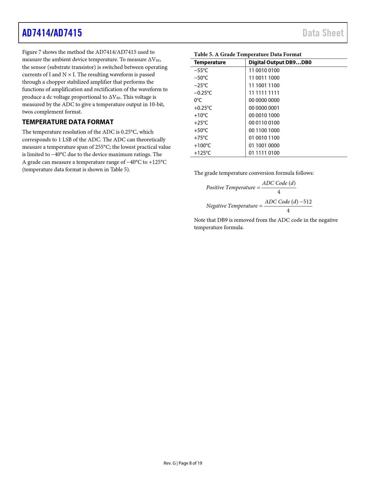 Pages / Page19 / 8 — AD7414/. AD7415. Data Sheet. Table 5. A Grade Temperature Data Format. …