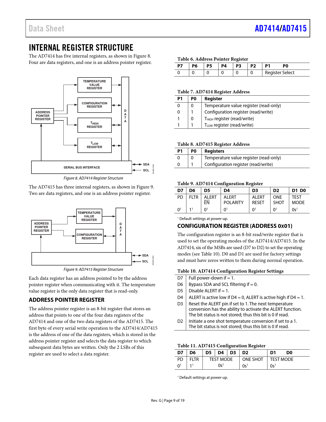 Data Sheet. AD7414/. AD7415. INTERNAL REGISTER STRUCTURE. Table 6. Address Pointer Register. P7 P6 P5 P4 P3 P2 P1 P0. TEMPERATURE