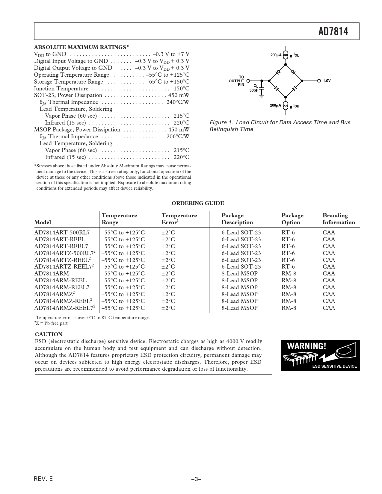 AD7814. ABSOLUTE MAXIMUM RATINGS*. 200. OUTPUT. 1.6V. PIN. 50pF. ORDERING GUIDE. Temperature. Package. Branding. Model. Range. Error1. Description