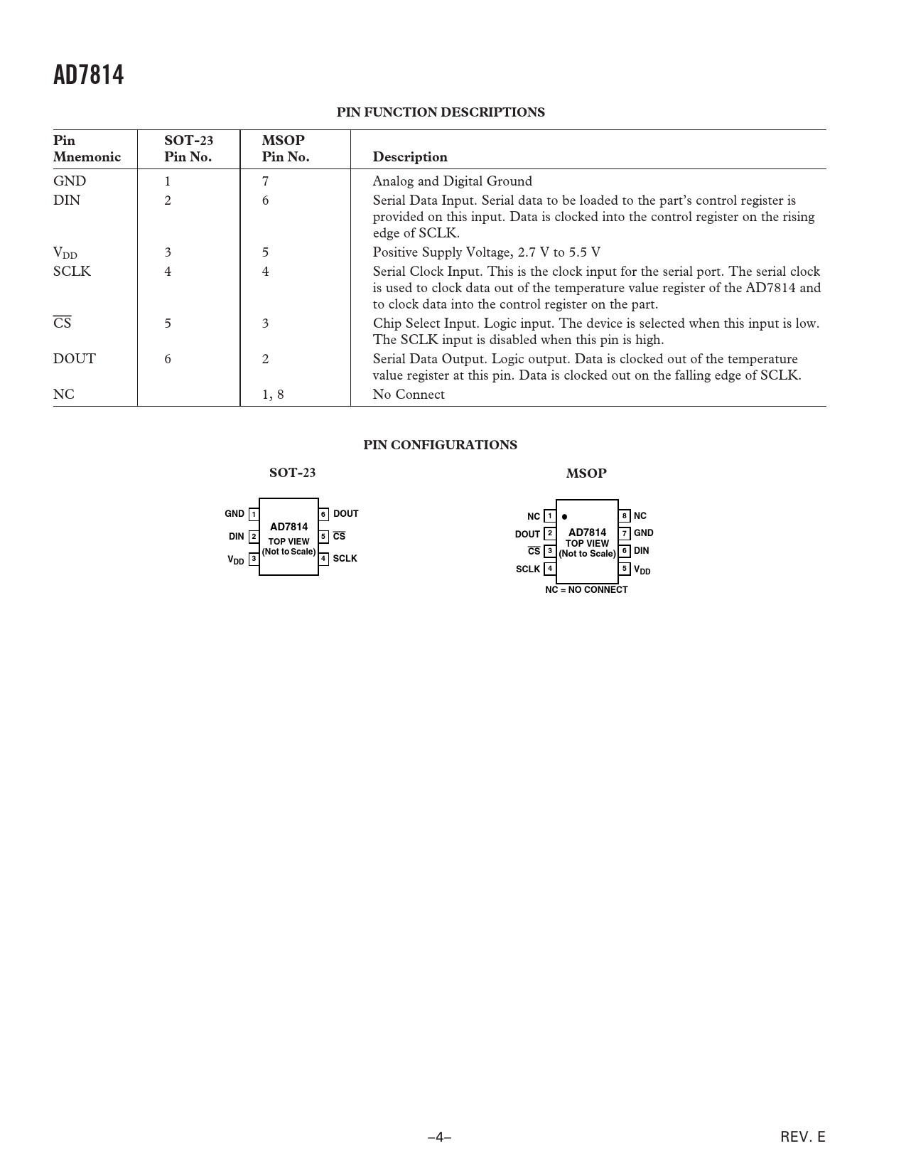 AD7814. PIN FUNCTION DESCRIPTIONS. Pin. SOT-23. MSOP. Mnemonic. Pin No. Description. PIN CONFIGURATIONS. GND 1. DOUT. NC 1. DIN 2. GND. TOP VIEW