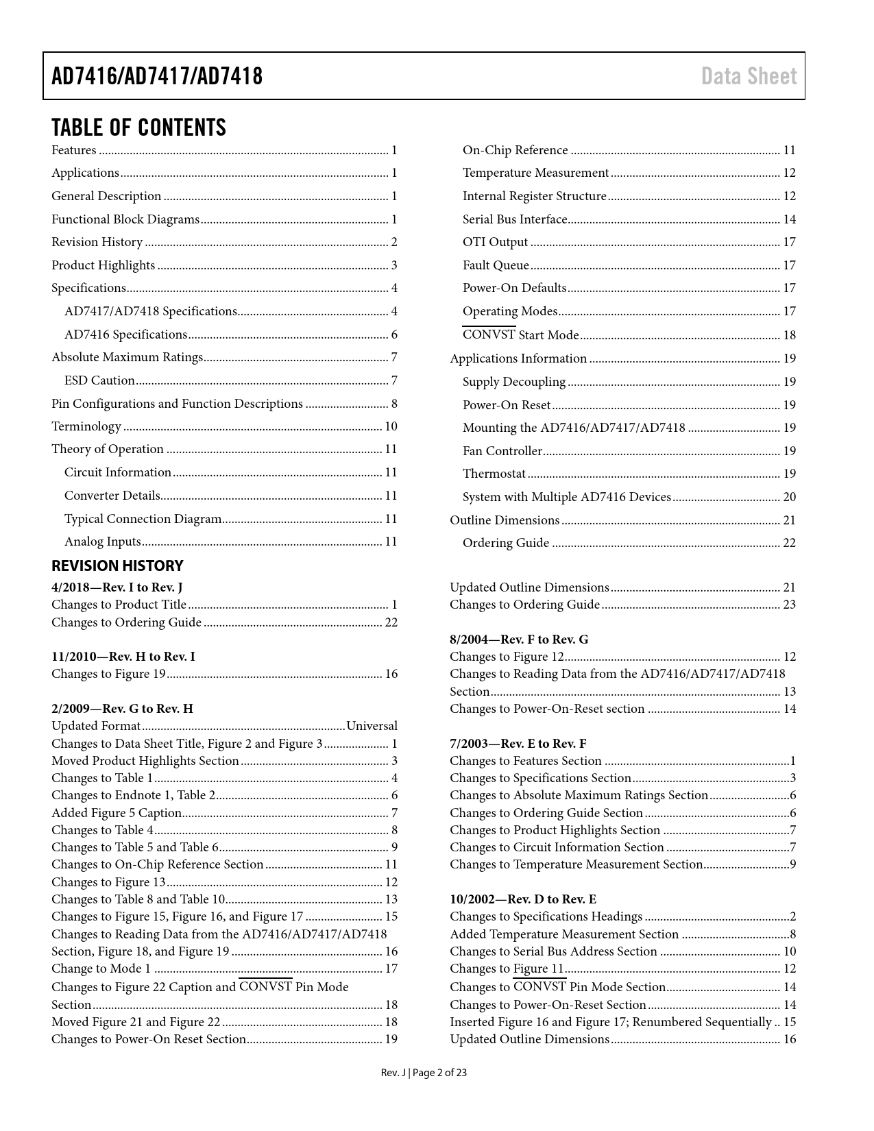 Pages / Page23 / 2 — AD7416/AD7417/AD7418. Data Sheet. TABLE OF CONTENTS. REVISION HISTORY …