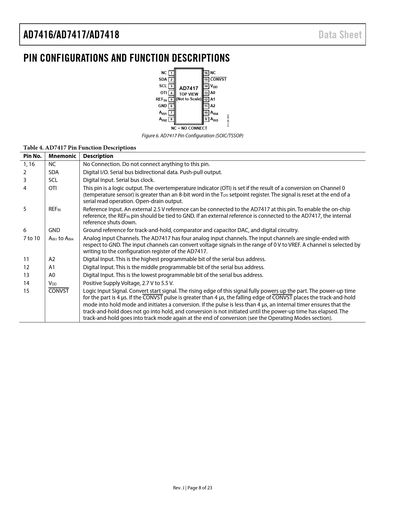 AD7416/AD7417/AD7418. Data Sheet. PIN CONFIGURATIONS AND FUNCTION DESCRIPTIONS. NC 1. 16 NC. SDA 2. 15 CONVST. SCL 3. 14 VDD. AD7417. OTI 4