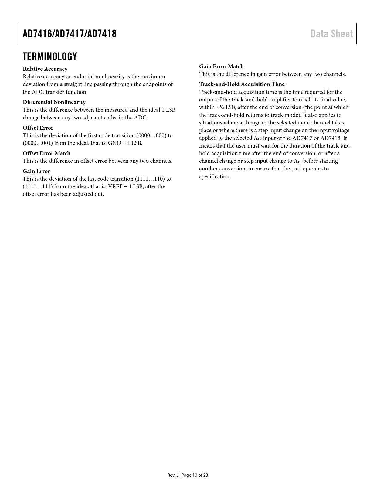 AD7416/AD7417/AD7418Data SheetTERMINOLOGY Relative AccuracyGain Error Match Relative accuracy or endpoint nonlinearity is the maximum This is the difference in gain error between any two channels. deviation from a straight line passing through the endpoints of Track-and-Hold Acquisition Time the ADC transfer function. Track-and-hold acquisition time is the time required for the Differential Nonlinearity output of the track-and-hold amplifier to reach its final value, This is the difference between the measured and the ideal 1 LSB within ±½ LSB, after the end of conversion (the point at which change between any two adjacent codes in the ADC. the track-and-hold returns to track mode). It also applies to situations where a change in the selected input channel takes Offset Error place or where there is a step input change on the input voltage This is the deviation of the first code transition (0000…000) to applied to the selected AIN input of the AD7417 or AD7418. It (0000…001) from the ideal, that is, GND + 1 LSB. means that the user must wait for the duration of the track-and- Offset Error Match hold acquisition time after the end of conversion, or after a This is the difference in offset error between any two channels. channel change or step input change to AIN before starting Gain Error another conversion, to ensure that the part operates to This is the deviation of the last code transition (1111…110) to specification. (1111…111) from the ideal, that is, VREF − 1 LSB, after the offset error has been adjusted out. Rev. J | Page 10 of 23 Document Outline FEATURES APPLICATIONS GENERAL DESCRIPTION FUNCTIONAL BLOCK DIAGRAMS TABLE OF CONTENTS REVISION HISTORY PRODUCT HIGHLIGHTS SPECIFICATIONS AD7417/AD7418 SPECIFICATIONS AD7416 SPECIFICATIONS ABSOLUTE MAXIMUM RATINGS ESD CAUTION PIN CONFIGURATIONS AND FUNCTION DESCRIPTIONS TERMINOLOGY THEORY OF OPERATION CIRCUIT INFORMATION CONVERTER DETAILS TYPICAL CONNECTION DIAGRAM ANALOG INPUTS ON-CHIP REFERENCE TEMPERATURE MEASUREMENT INTERNAL REGISTER STRUCTURE Address Pointer Register Temperature Value Register (Address 0x00) Configuration Register (Address 0x01) THYST Setpoint Register (Address 0x02) TOTI Setpoint Register (Address 0x03) ADC Value Register (Address 0x04) ADC Transfer Function Config2 Register (Address 0x05) SERIAL BUS INTERFACE Serial Bus Address Writing to the AD7416/AD7417/AD7418 Reading Data From the AD7416/AD7417/AD7418 OTI OUTPUT FAULT QUEUE POWER-ON DEFAULTS OPERATING MODES Mode 1 Mode 2 CONVSTB START MODE CONVSTB Pin Mode APPLICATIONS INFORMATION SUPPLY DECOUPLING POWER-ON RESET MOUNTING THE AD7416/AD7417/AD7418 FAN CONTROLLER THERMOSTAT SYSTEM WITH MULTIPLE AD7416 DEVICES OUTLINE DIMENSIONS ORDERING GUIDE