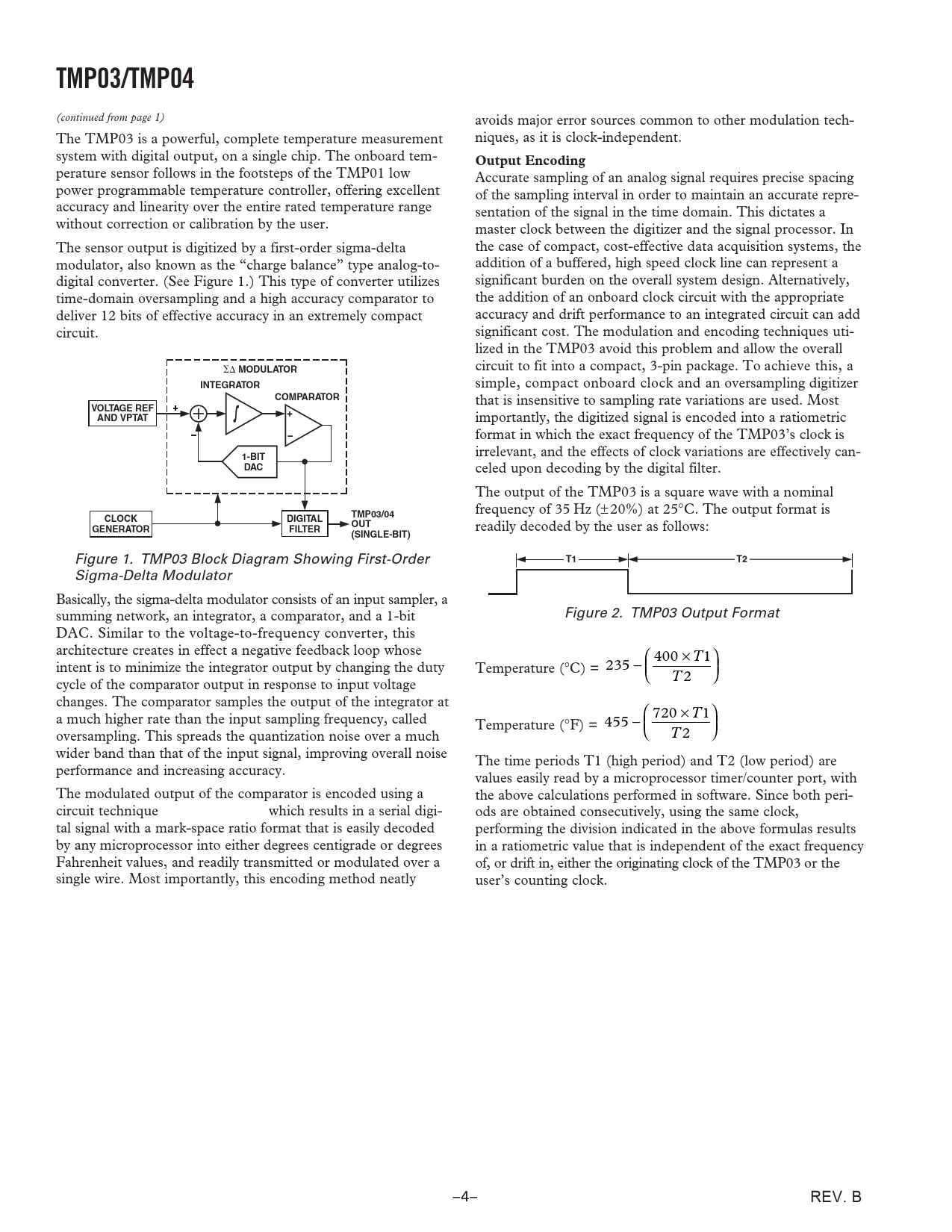 importantly, the digitized signal is encoded into a ratiometric format in which the exact frequency of the TMP03’s clock is irrelevant, and the effects of clock variations are effectively can-