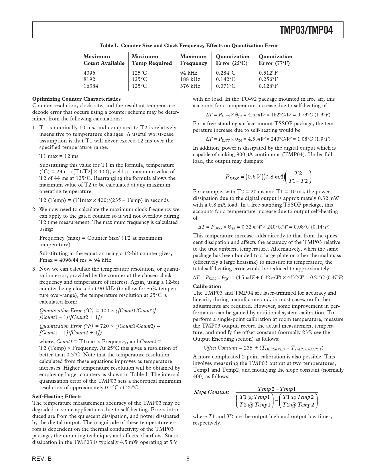 ture over-range), the temperature resolution at 25°C is The TMP03 and TMP04 are laser-trimmed for accuracy and calculated from: linearity during manufacture and, in most cases, no further adjustments are required. However, some improvement in per- Quantization Error (°C) = 400 × ([Count1/Count2] – formance can be gained by additional system calibration. To [Count1 – 1]/[Count2 + 1]) perform a single-point calibration at room temperature, measure Quantization Error (°F) = 720 × ([Count1/Count2] – the TMP03 output, record the actual measurement tempera- [Count1 – 1]/[Count2 + 1]) ture, and modify the offset constant (normally 235; see the Output Encoding section) as follows: where, Count1 = T1max × Frequency, and Count2 = T2 (Temp) × Frequency. At 25°C this gives a resolution of Offset Constant = 235 + (TOBSERVED – TTMP03OUTPUT) better than 0.3°C. Note that the temperature resolution A more complicated 2-point calibration is also possible. This calculated from these equations improves as temperature involves measuring the TMP03 output at two temperatures, increases. Higher temperature resolution will be obtained by Temp1 and Temp2, and modifying the slope constant (normally employing larger counters as shown in Table I. The internal 400) as follows: quantization error of the TMP03 sets a theoretical minimum resolution of approximately 0.1°C at 25°C. Slope Constant = Temp 2 − Temp1