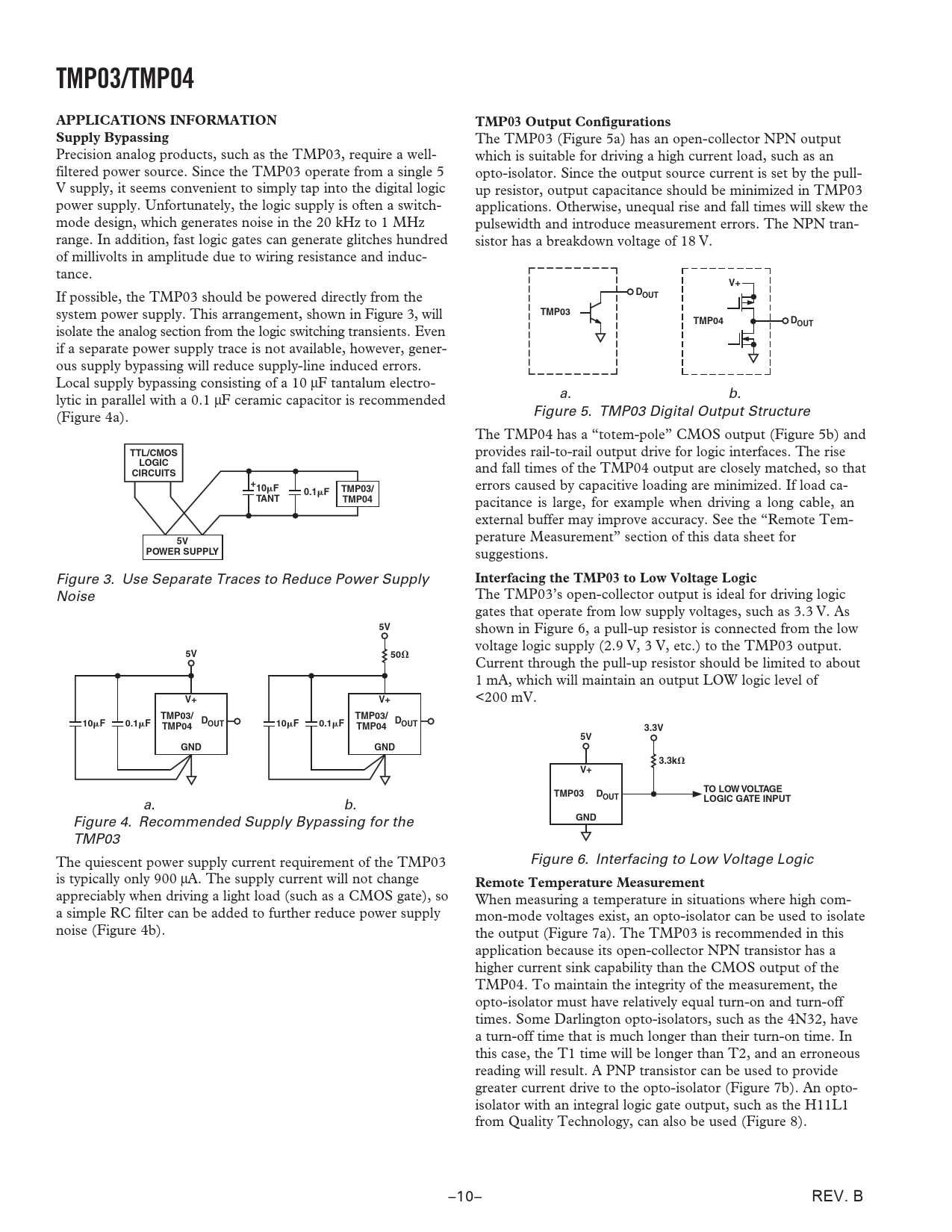 TMP03/TMP04APPLICATIONS INFORMATIONTMP03 Output ConfigurationsSupply Bypassing The TMP03 (Figure 5a) has an open-collector NPN output Precision analog products, such as the TMP03, require a well- which is suitable for driving a high current load, such as an filtered power source. Since the TMP03 operate from a single 5 opto-isolator. Since the output source current is set by the pull- V supply, it seems convenient to simply tap into the digital logic up resistor, output capacitance should be minimized in TMP03 power supply. Unfortunately, the logic supply is often a switch- applications. Otherwise, unequal rise and fall times will skew the mode design, which generates noise in the 20 kHz to 1 MHz pulsewidth and introduce measurement errors. The NPN tran- range. In addition, fast logic gates can generate glitches hundred sistor has a breakdown voltage of 18 V. of millivolts in amplitude due to wiring resistance and induc- tance. V+ If possible, the TMP03 should be powered directly from the DOUT system power supply. This arrangement, shown in Figure 3, will TMP03TMP04DOUT isolate the analog section from the logic switching transients. Even if a separate power supply trace is not available, however, gener- ous supply bypassing will reduce supply-line induced errors. Local supply bypassing consisting of a 10 µF tantalum electro- lytic in parallel with a 0.1 µF ceramic capacitor is recommended a. b. (Figure 4a). Figure 5. TMP03 Digital Output Structure The TMP04 has a “totem-pole” CMOS output (Figure 5b) and TTL/CMOS provides rail-to-rail output drive for logic interfaces. The rise LOGIC and fall times of the TMP04 output are closely matched, so that CIRCUITS+10FTMP03/ errors caused by capacitive loading are minimized. If load ca- 0.1FTANTTMP04 pacitance is large, for example when driving a long cable, an external buffer may improve accuracy. See the “Remote Tem- 5V perature Measurement” section of this data sheet for POWER SUPPLY suggestions. Figure 3. Use Separate Traces to Reduce Power Supply Interfacing the TMP03 to Low Voltage Logic Noise The TMP03’s open-collector output is ideal for driving logic gates that operate from low supply voltages, such as 3.3 V. As 5V shown in Figure 6, a pull-up resistor is connected from the low voltage logic supply (2.9 V, 3 V, etc.) to the TMP03 output. 5V50 Current through the pull-up resistor should be limited to about 1 mA, which will maintain an output LOW logic level of V+V+ <200 mV. TMP03/TMP03/10F0.1FDDTMP04OUT10F0.1FTMP04OUT3.3V5VGNDGND3.3kV+TO LOW VOLTAGETMP03DOUT a. b. LOGIC GATE INPUT Figure 4. Recommended Supply Bypassing for the GND TMP03 The quiescent power supply current requirement of the TMP03 Figure 6. Interfacing to Low Voltage Logic is typically only 900 µA. The supply current will not change Remote Temperature Measurement appreciably when driving a light load (such as a CMOS gate), so When measuring a temperature in situations where high com- a simple RC filter can be added to further reduce power supply mon-mode voltages exist, an opto-isolator can be used to isolate noise (Figure 4b). the output (Figure 7a). The TMP03 is recommended in this application because its open-collector NPN transistor has a higher current sink capability than the CMOS output of the TMP04. To maintain the integrity of the measurement, the opto-isolator must have relatively equal turn-on and turn-off times. Some Darlington opto-isolators, such as the 4N32, have a turn-off time that is much longer than their turn-on time. In this case, the T1 time will be longer than T2, and an erroneous reading will result. A PNP transistor can be used to provide greater current drive to the opto-isolator (Figure 7b). An opto- isolator with an integral logic gate output, such as the H11L1 from Quality Technology, can also be used (Figure 8). –10– REV. B REV. B Document Outline RevHistory_TMP03_04.pdf REVISION HISTORY