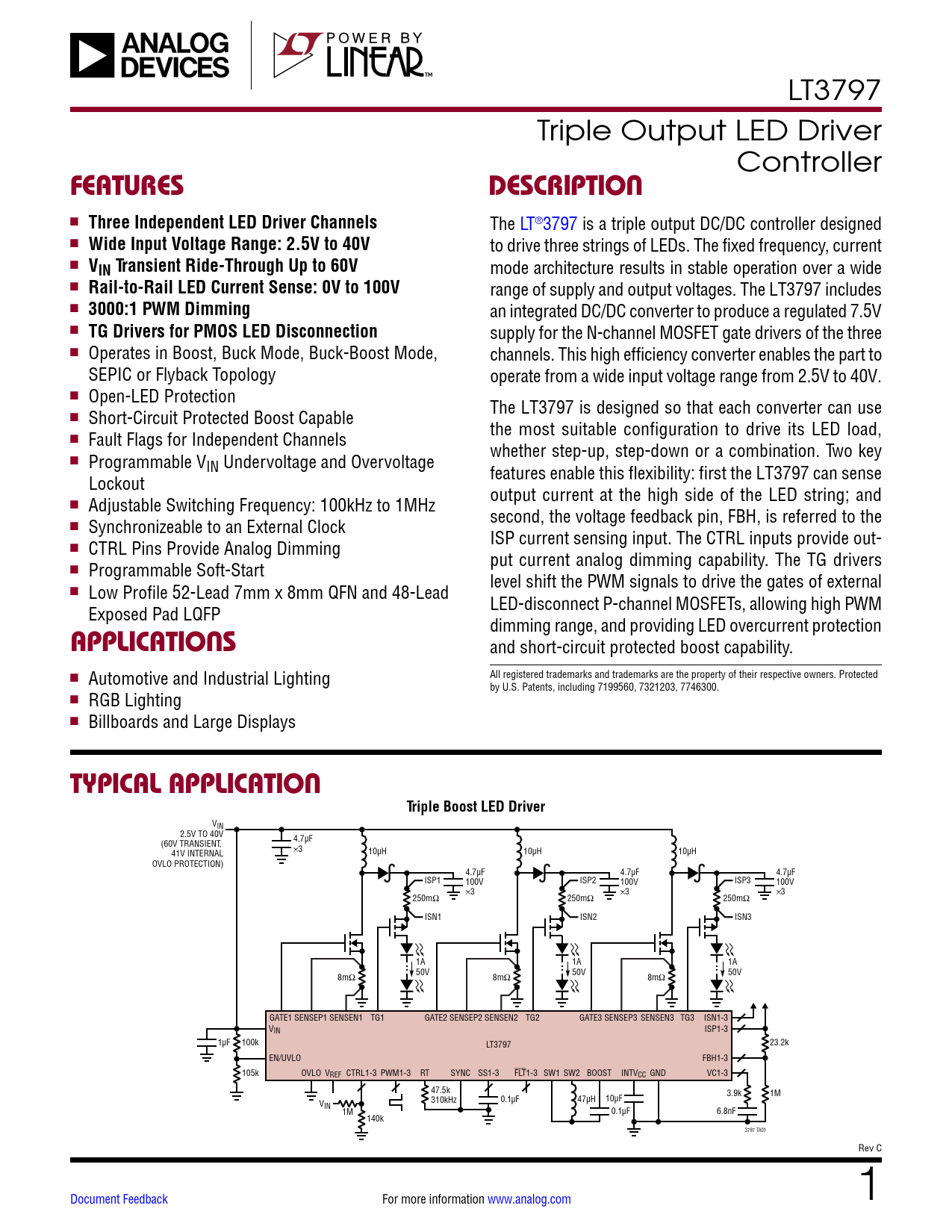 LT3797 Triple Output LED Driver Controller FEATURESDESCRIPTION n Three Independent LED Driver Channels The LT®3797 is a triple output DC/DC controller designed n Wide Input Voltage Range: 2.5V to 40V to drive three strings of LEDs. The fixed frequency, current n VIN Transient Ride-Through Up to 60V mode architecture results in stable operation over a wide n Rail-to-Rail LED Current Sense: 0V to 100V range of supply and output voltages. The LT3797 includes n 3000:1 PWM Dimming an integrated DC/DC converter to produce a regulated 7.5V n TG Drivers for PMOS LED Disconnection supply for the N-channel MOSFET gate drivers of the three n Operates in Boost, Buck Mode, Buck-Boost Mode, channels. This high efficiency converter enables the part to SEPIC or Flyback Topology operate from a wide input voltage range from 2.5V to 40V. n Open-LED Protection The LT3797 is designed so that each converter can use n Short-Circuit Protected Boost Capable the most suitable configuration to drive its LED load, n Fault Flags for Independent Channels whether step-up, step-down or a combination. Two key n Programmable VIN Undervoltage and Overvoltage features enable this flexibility: first the LT3797 can sense Lockout output current at the high side of the LED string; and n Adjustable Switching Frequency: 100kHz to 1MHz second, the voltage feedback pin, FBH, is referred to the n Synchronizeable to an External Clock ISP current sensing input. The CTRL inputs provide out- n CTRL Pins Provide Analog Dimming put current analog dimming capability. The TG drivers n Programmable Soft-Start level shift the PWM signals to drive the gates of external n Low Profile 52-Lead 7mm x 8mm QFN and 48-Lead LED-disconnect P-channel MOSFETs, allowing high PWM Exposed Pad LQFP dimming range, and providing LED overcurrent protection APPLICATIONS and short-circuit protected boost capability. n Automotive and Industrial Lighting All registered trademarks and trademarks are the property of their respective owners. Protected by U.S. Patents, including 7199560, 7321203, 7746300. n RGB Lighting n Billboards and Large Displays TYPICAL APPLICATIONTriple Boost LED Driver VIN 2.5V TO 40V 4.7µF (60V TRANSIENT, ×3 41V INTERNAL 10µH 10µH 10µH OVLO PROTECTION) 4.7µF 4.7µF 4.7µF ISP1 100V ISP2 100V ISP3 100V ×3 ×3 ×3 250mΩ 250mΩ 250mΩ ISN1 ISN2 ISN3 1A 1A 1A 50V 50V 50V 8mΩ 8mΩ 8mΩ GATE1 SENSEP1 SENSEN1 TG1 GATE2 SENSEP2 SENSEN2 TG2 GATE3 SENSEP3 SENSEN3 TG3 ISN1-3 VIN ISP1-3 1µF 100k 23.2k LT3797 EN/UVLO FBH1-3 105k OVLO VREF CTRL1-3 PWM1-3 RT SYNC SS1-3 FLT1-3 SW1 SW2 BOOST INTVCC GND VC1-3 47.5k 3.9k 1M V 310kHz 0.1µF 47µH 10µF IN 1M 0.1µF 6.8nF 140k 3797 TA01 Rev C Document Feedback For more information www.analog.com 1 Document Outline Features Applications Description Typical Application Absolute Maximum Ratings Pin Configuration Electrical Characteristics Typical Performance Characteristics Pin Functions Block Diagram Operation Applications Information Revision History Typical Application Related Parts Features Applications Typical Application Description Absolute Maximum Ratings Pin Configuration Order Information Electrical Characteristics Typical Performance Characteristics Pin Functions Block Diagram Operation Applications Information Typical Applications Package Description Revision History Typical Application Related Parts