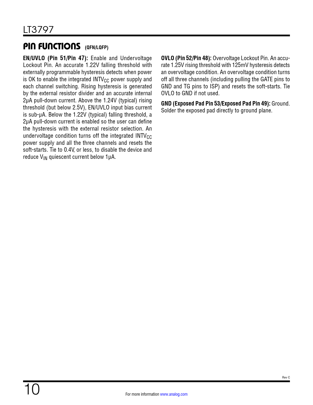 PIN FUNCTIONS (QFN/LQFP) EN/UVLO (Pin 51/Pin 47): OVLO (Pin 52/Pin 48): GND (Exposed Pad Pin 53/Exposed Pad Pin 49):