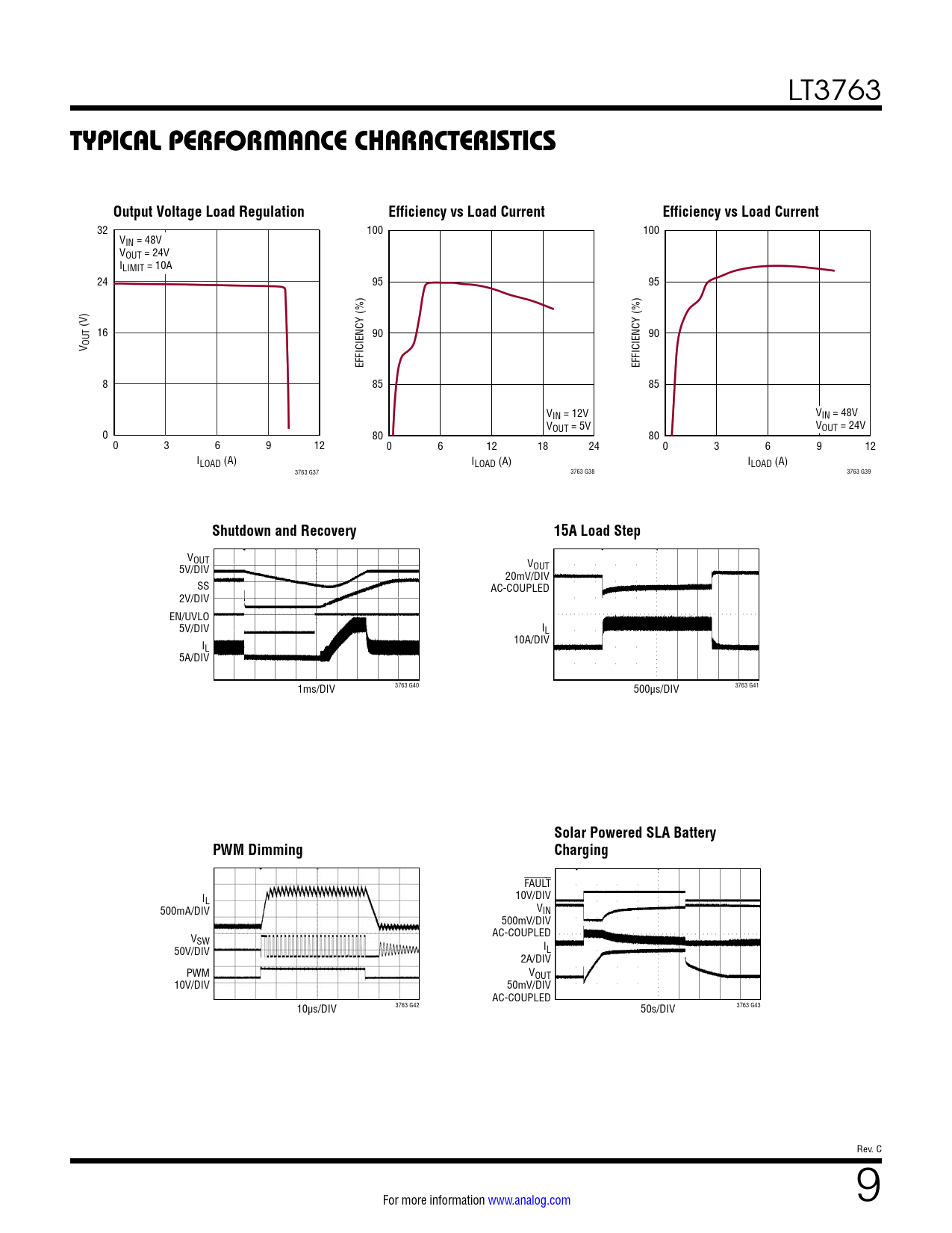 32 100 100 VIN = 48V VOUT = 24V ILIMIT = 10A 24 95 95 (V) 16 90 90 V OUT EFFICIENCY (%) EFFICIENCY (%) 8 85 85 VIN = 12V VIN = 48V V VOUT = 24V 0 OUT = 5V 80 80 0 3 6 9 12 0 6 12 18 24 0 3 6 9 12 ILOAD (A) ILOAD (A) ILOAD (A) 3763 G37 3763 G38 3763 G39