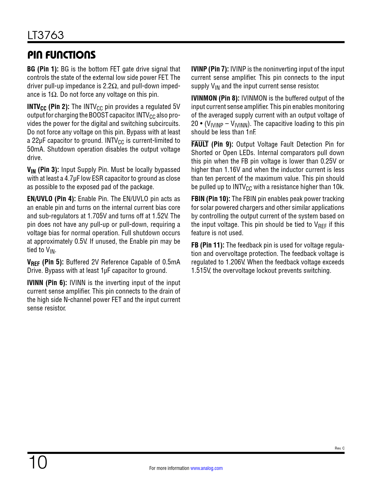 IVINN is the inverting input of the input current sense amplifier. This pin connects to the drain of the high side N-channel power FET and the input current sense resistor. Rev. C 10 For more information www.analog.com Document Outline Features Applications Typical Application Description Absolute Maximum Ratings Order Information Electrical Characteristics Pin Configuration Electrical Characteristics Typical Performance Characteristics Pin Functions Block Diagram Operation Applications Information Package Description Revision History Typical Application Related Parts