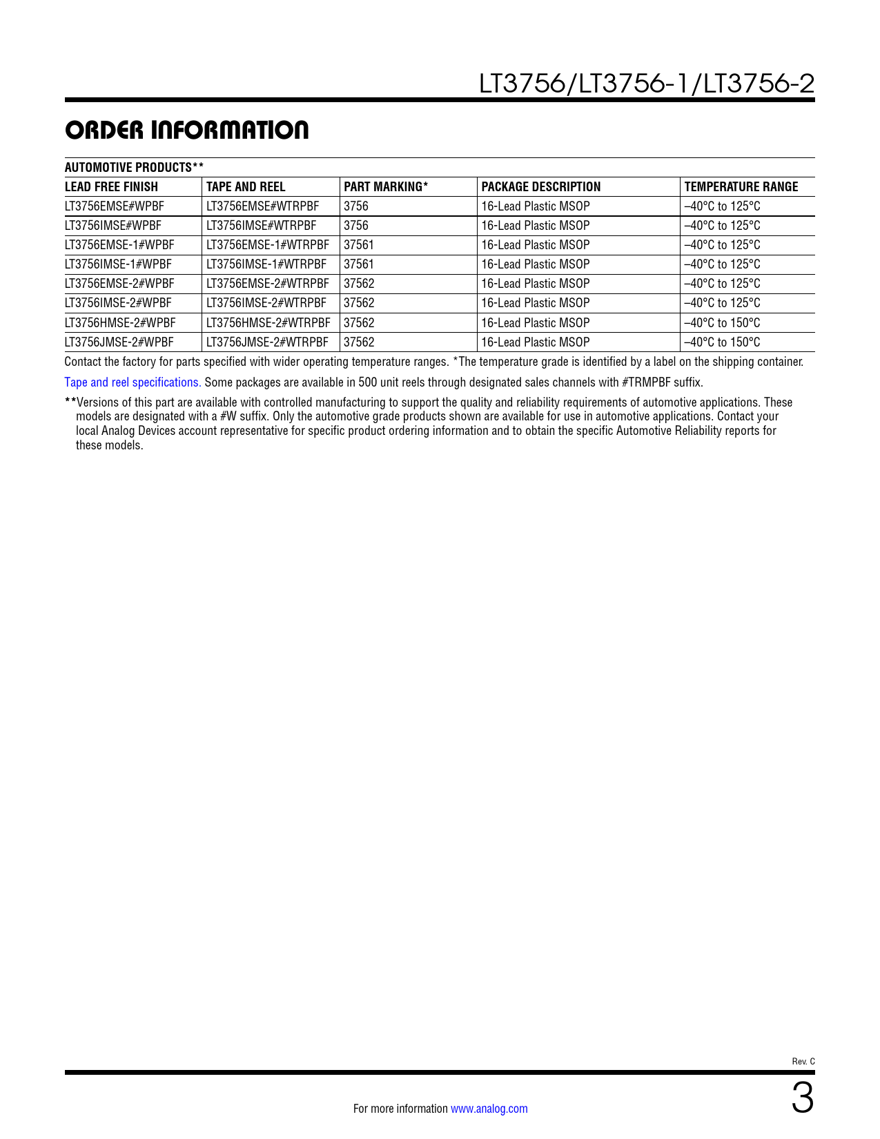 LT3756/LT3756-1/LT3756-2 ORDER INFORMATION AUTOMOTIVE PRODUCTS** LEAD FREE FINISHTAPE AND REELPART MARKING*PACKAGE DESCRIPTIONTEMPERATURE RANGE LT3756EMSE#WPBF LT3756EMSE#WTRPBF 3756 16-Lead Plastic MSOP –40°C to 125°C LT3756IMSE#WPBF LT3756IMSE#WTRPBF 3756 16-Lead Plastic MSOP –40°C to 125°C LT3756EMSE-1#WPBF LT3756EMSE-1#WTRPBF 37561 16-Lead Plastic MSOP –40°C to 125°C LT3756IMSE-1#WPBF LT3756IMSE-1#WTRPBF 37561 16-Lead Plastic MSOP –40°C to 125°C LT3756EMSE-2#WPBF LT3756EMSE-2#WTRPBF 37562 16-Lead Plastic MSOP –40°C to 125°C LT3756IMSE-2#WPBF LT3756IMSE-2#WTRPBF 37562 16-Lead Plastic MSOP –40°C to 125°C LT3756HMSE-2#WPBF LT3756HMSE-2#WTRPBF 37562 16-Lead Plastic MSOP –40°C to 150°C LT3756JMSE-2#WPBF LT3756JMSE-2#WTRPBF 37562 16-Lead Plastic MSOP –40°C to 150°C Contact the factory for parts specified with wider operating temperature ranges. *The temperature grade is identified by a label on the shipping container. Tape and reel specifications. Some packages are available in 500 unit reels through designated sales channels with #TRMPBF suffix. ** Versions of this part are available with controlled manufacturing to support the quality and reliability requirements of automotive applications. These models are designated with a #W suffix. Only the automotive grade products shown are available for use in automotive applications. Contact your local Analog Devices account representative for specific product ordering information and to obtain the specific Automotive Reliability reports for these models. Rev. C For more information www.analog.com 3 Document Outline Features Applications Typical Application Description Absolute Maximum Ratings Pin Configuration Order Information Electrical Characteristics Typical Performance Characteristics Pin Functions Block Diagram Operation Applications Information Package Description Revision History Typical Application Related Parts