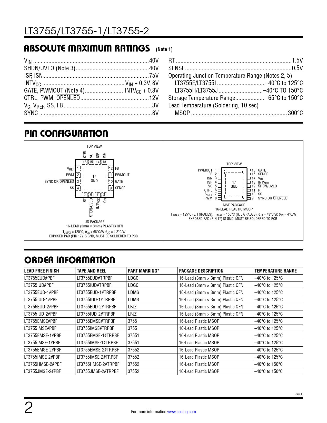 LT3755EUD#PBF LT3755EUD#TRPBF LDGC 16-Lead (3mm × 3mm) Plastic QFN –40°C to 125°C LT3755IUD#PBF LT3755IUD#TRPBF LDGC 16-Lead (3mm × 3mm) Plastic QFN –40°C to 125°C LT3755EUD-1#PBF LT3755EUD-1#TRPBF LDMS 16-Lead (3mm × 3mm) Plastic QFN –40°C to 125°C LT3755IUD-1#PBF LT3755IUD-1#TRPBF LDMS 16-Lead (3mm × 3mm) Plastic QFN –40°C to 125°C LT3755EUD-2#PBF LT3755EUD-2#TRPBF LFJZ 16-Lead (3mm × 3mm) Plastic QFN –40°C to 125°C LT3755IUD-2#PBF LT3755IUD-2#TRPBF LFJZ 16-Lead (3mm × 3mm) Plastic QFN –40°C to 125°C LT3755EMSE#PBF LT3755EMSE#TRPBF 3755 16-Lead Plastic MSOP –40°C to 125°C LT3755IMSE#PBF LT3755IMSE#TRPBF 3755 16-Lead Plastic MSOP –40°C to 125°C LT3755EMSE-1#PBF LT3755EMSE-1#TRPBF 37551 16-Lead Plastic MSOP –40°C to 125°C LT3755IMSE-1#PBF LT3755IMSE-1#TRPBF 37551 16-Lead Plastic MSOP –40°C to 125°C LT3755EMSE-2#PBF LT3755EMSE-2#TRPBF 37552 16-Lead Plastic MSOP –40°C to 125°C LT3755IMSE-2#PBF LT3755IMSE-2#TRPBF 37552 16-Lead Plastic MSOP –40°C to 125°C LT3755HMSE-2#PBF LT3755HMSE-2#TRPBF 37552 16-Lead Plastic MSOP –40°C to 150°C LT3755JMSE-2#PBF LT3755JMSE-2#TRPBF 37552 16-Lead Plastic MSOP –40°C to 150°C Rev. E 2 For more information www.analog.com Document Outline Features Applications Typical Application Description Absolute Maximum Ratings Pin Configuration Order information Electrical Characteristics Typical Performance Characteristics Pin Functions Block Diagram Operation Applications Information Typical Applications Package Description Revision History Typical Application Related Parts