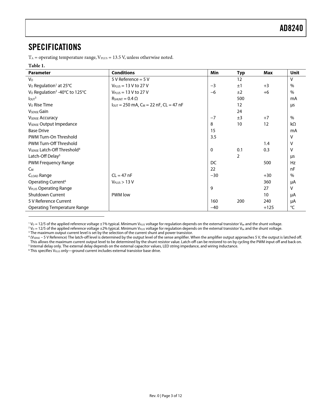 link to page 3 link to page 3 link to page 3 link to page 3 link to page 3 link to page 3 AD8240SPECIFICATIONS TA = operating temperature range, VPLUS = 13.5 V, unless otherwise noted. Table 1. Parameter ConditionsMinTypMaxUnit VO 5 V Reference = 5 V 12 V VO Regulation1 at 25°C VPLUS = 13 V to 27 V −3 ±1 +3 % VO Regulation2 -40°C to 125°C VPLUS = 13 V to 27 V −6 ±2 +6 % I 3 OUT RSHUNT = 0.4 Ω 500 mA VO Rise Time IOUT = 250 mA, CM = 22 nF, CL = 47 nF 12 µs VSENSE Gain 24 VSENSE Accuracy −7 ±3 +7 % VSENSE Output Impedance 8 10 12 kΩ Base Drive 15 mA PWM Turn-On Threshold 3.5 V PWM Turn-Off Threshold 1.4 V VSENSE Latch-Off Threshold4 0 0.1 0.3 V Latch-Off Delay5 2 µs PWM Frequency Range DC 500 Hz CM 22 nF CLOAD Range CL = 47 nF −30 +30 % Operating Current6 VPLUS > 13 V 360 µA VPLUS Operating Range 9 27 V Shutdown Current PWM low 10 µA 5 V Reference Current 160 200 240 µA Operating Temperature Range −40 +125 °C 1 VO = 12/5 of the applied reference voltage ±1% typical. Minimum VPLUS voltage for regulation depends on the external transistor Vbe and the shunt voltage. 2 VO = 12/5 of the applied reference voltage ±2% typical. Minimum VPLUS voltage for regulation depends on the external transistor Vbe and the shunt voltage. 3 The maximum output current level is set by the selection of the current shunt and power transistor. 4 (VSENSE – 5 V Reference) The latch-off level is determined by the output level of the sense amplifier. When the amplifier output approaches 5 V, the output is latched off. This allows the maximum current output level to be determined by the shunt resistor value. Latch-off can be restored to on by cycling the PWM input off and back on. 5 Internal delay only. The external delay depends on the external capacitor values, LED string impedance, and wiring inductance. 6 This specifies VPLUS only—ground current includes external transistor base drive. Rev. 0 | Page 3 of 12 Document Outline FEATURES GENERAL DESCRIPTION FUNCTIONAL BLOCK DIAGRAM PRODUCT HIGHLIGHTS SPECIFICATIONS ABSOLUTE MAXIMUM RATINGS PRODUCT DESCRIPTION LINEAR REGULATOR (BLOCK A) HIGH-SIDE CURRENT-SENSE AMPLIFIER WITH OPEN LED DETECTION (B COMPARATOR WITH LATCH-OFF OVERCURRENT PROTECTION (BLOCK C) INTELLIGENT DRIVER (BLOCK D) USING/EVALUATING THE AD8240 LED DRIVER MONITOR SETUP Shunt Resistor Selection Circuit Configuration CONTROLLING THE LED LAMP USING/EVALUATING THE VSENSE OUTPUT Using/Evaluating the Short-Circuit Protection Feature ADVANTAGES OF DRIVING LED LAMPS WITH CONSTANT VOLTAGE BACKGROUND MONITORING THE LEDS DRIVING AUTOMOTIVE LEDS Constant Current Constant Voltage OUTLINE DIMENSIONS ORDERING GUIDE