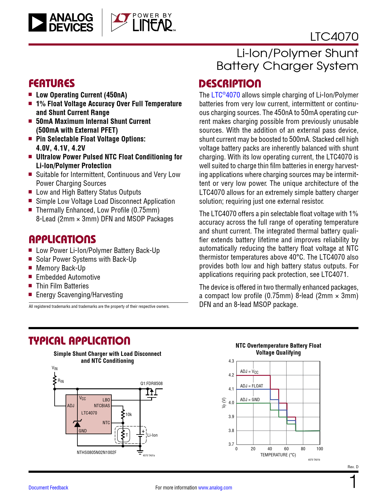 LTC4070 Li-Ion/Polymer Shunt Battery Charger System FEATURESDESCRIPTION n Low Operating Current (450nA) The LTC®4070 allows simple charging of Li-Ion/Polymer n 1% Float Voltage Accuracy Over Full Temperature batteries from very low current, intermittent or continu- and Shunt Current Range ous charging sources. The 450nA to 50mA operating cur- n 50mA Maximum Internal Shunt Current rent makes charging possible from previously unusable (500mA with External PFET) sources. With the addition of an external pass device, n Pin Selectable Float Voltage Options: shunt current may be boosted to 500mA. Stacked cell high 4.0V, 4.1V, 4.2V voltage battery packs are inherently balanced with shunt n Ultralow Power Pulsed NTC Float Conditioning for charging. With its low operating current, the LTC4070 is Li-Ion/Polymer Protection well suited to charge thin film batteries in energy harvest- n Suitable for Intermittent, Continuous and Very Low ing applications where charging sources may be intermit- Power Charging Sources tent or very low power. The unique architecture of the n Low and High Battery Status Outputs LTC4070 allows for an extremely simple battery charger n Simple Low Voltage Load Disconnect Application solution; requiring just one external resistor. n Thermally Enhanced, Low Profile (0.75mm) The LTC4070 offers a pin selectable float voltage with 1% 8-Lead (2mm × 3mm) DFN and MSOP Packages accuracy across the full range of operating temperature and shunt current. The integrated thermal battery quali- APPLICATIONS fier extends battery lifetime and improves reliability by n automatically reducing the battery float voltage at NTC Low Power Li-Ion/Polymer Battery Back-Up n thermistor temperatures above 40°C. The LTC4070 also Solar Power Systems with Back-Up n provides both low and high battery status outputs. For Memory Back-Up n applications requiring pack protection, see LTC4071. Embedded Automotive n Thin Film Batteries The device is offered in two thermally enhanced packages, n Energy Scavenging/Harvesting a compact low profile (0.75mm) 8-lead (2mm × 3mm) All registered trademarks and trademarks are the property of their respective owners. DFN and an 8-lead MSOP package. TYPICAL APPLICATIONNTC Overtemperature Battery FloatSimple Shunt Charger with Load DisconnectVoltage Qualifyingand NTC Conditioning 4.3 VIN ADJ = V 4.2 CC RIN Q1:FDR8508 ADJ = FLOAT 4.1 VCC LBO (V) ADJ = GND 4.0 ADJ NTCBIAS V F LTC4070 10k 3.9 NTC GND + 3.8 T Li-Ion 3.7 0 20 40 60 80 100 NTHS0805N02N1002F 4070 TA01a TEMPERATURE (°C) 4070 TA01b Rev. D Document Feedback For more information www.analog.com 1 Document Outline Features Applications Typical Application Description Absolute Maximum Ratings Pin Configuration Order Information Electrical Characteristics Typical Performance Characteristics Pin Functions Block Diagram Operation Applications Information Typical Applications Package Description Revision History Typical Application Related Parts