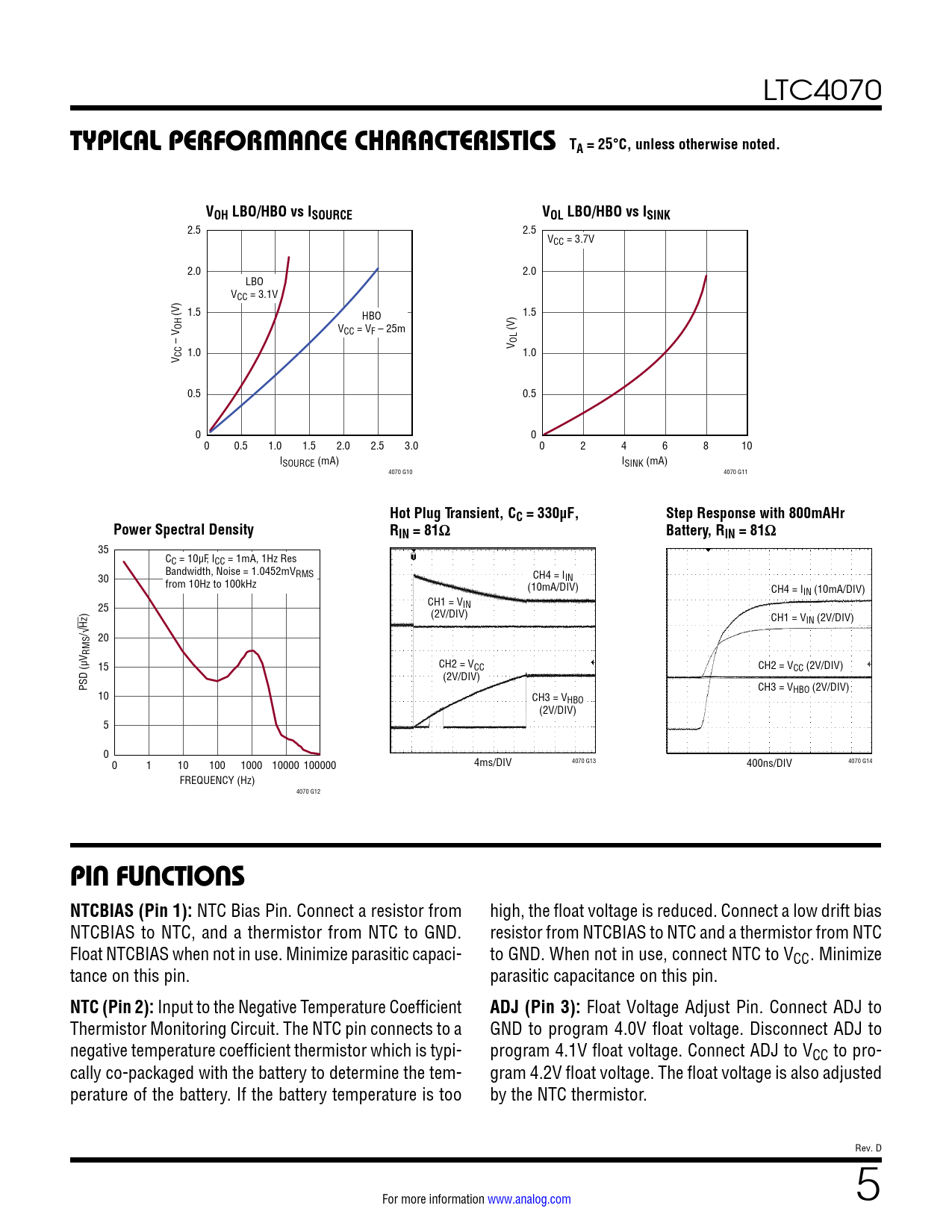 LTC4070 TYPICAL PERFORMANCE CHARACTERISTICS TA = 25°C, unless otherwise noted.VOH LBO/HBO vs ISOURCEVOL LBO/HBO vs ISINK 2.5 2.5 VCC = 3.7V 2.0 2.0 LBO VCC = 3.1V (V) 1.5 HBO 1.5 OH VCC = VF – 25m (V) – V V OL V CC 1.0 1.0 0.5 0.5 0 0 0 0.5 1.0 1.5 2.0 2.5 3.0 0 2 4 6 8 10 ISOURCE (mA) ISINK (mA) 4070 G10 4070 G11 Hot Plug Transient, CC = 330µF,Step Response with 800mAHrPower Spectral DensityRIN = 81ΩBattery, RIN = 81Ω 35 CC = 10µF, ICC = 1mA, 1Hz Res Bandwidth, Noise = 1.0452mVRMS CH4 = I 30 IN from 10Hz to 100kHz (10mA/DIV) CH4 = IIN (10mA/DIV) CH1 = VIN ) 25 (2V/DIV) CH1 = VIN (2V/DIV) Hz /√ 20 V RMS 15 CH2 = VCC CH2 = VCC (2V/DIV) (2V/DIV) PSD (µ CH3 = VHBO (2V/DIV) 10 CH3 = VHBO (2V/DIV) 5 0 0 1 10 100 1000 10000 100000 4ms/DIV 4070 G13 400ns/DIV 4070 G14 FREQUENCY (Hz) 4070 G12 PIN FUNCTIONS NTCBIAS (Pin 1): NTC Bias Pin. Connect a resistor from high, the float voltage is reduced. Connect a low drift bias NTCBIAS to NTC, and a thermistor from NTC to GND. resistor from NTCBIAS to NTC and a thermistor from NTC Float NTCBIAS when not in use. Minimize parasitic capaci- to GND. When not in use, connect NTC to VCC. Minimize tance on this pin. parasitic capacitance on this pin. NTC (Pin 2): Input to the Negative Temperature Coefficient ADJ (Pin 3): Float Voltage Adjust Pin. Connect ADJ to Thermistor Monitoring Circuit. The NTC pin connects to a GND to program 4.0V float voltage. Disconnect ADJ to negative temperature coefficient thermistor which is typi- program 4.1V float voltage. Connect ADJ to VCC to pro- cally co-packaged with the battery to determine the tem- gram 4.2V float voltage. The float voltage is also adjusted perature of the battery. If the battery temperature is too by the NTC thermistor. Rev. D For more information www.analog.com 5 Document Outline Features Applications Typical Application Description Absolute Maximum Ratings Pin Configuration Order Information Electrical Characteristics Typical Performance Characteristics Pin Functions Block Diagram Operation Applications Information Typical Applications Package Description Revision History Typical Application Related Parts