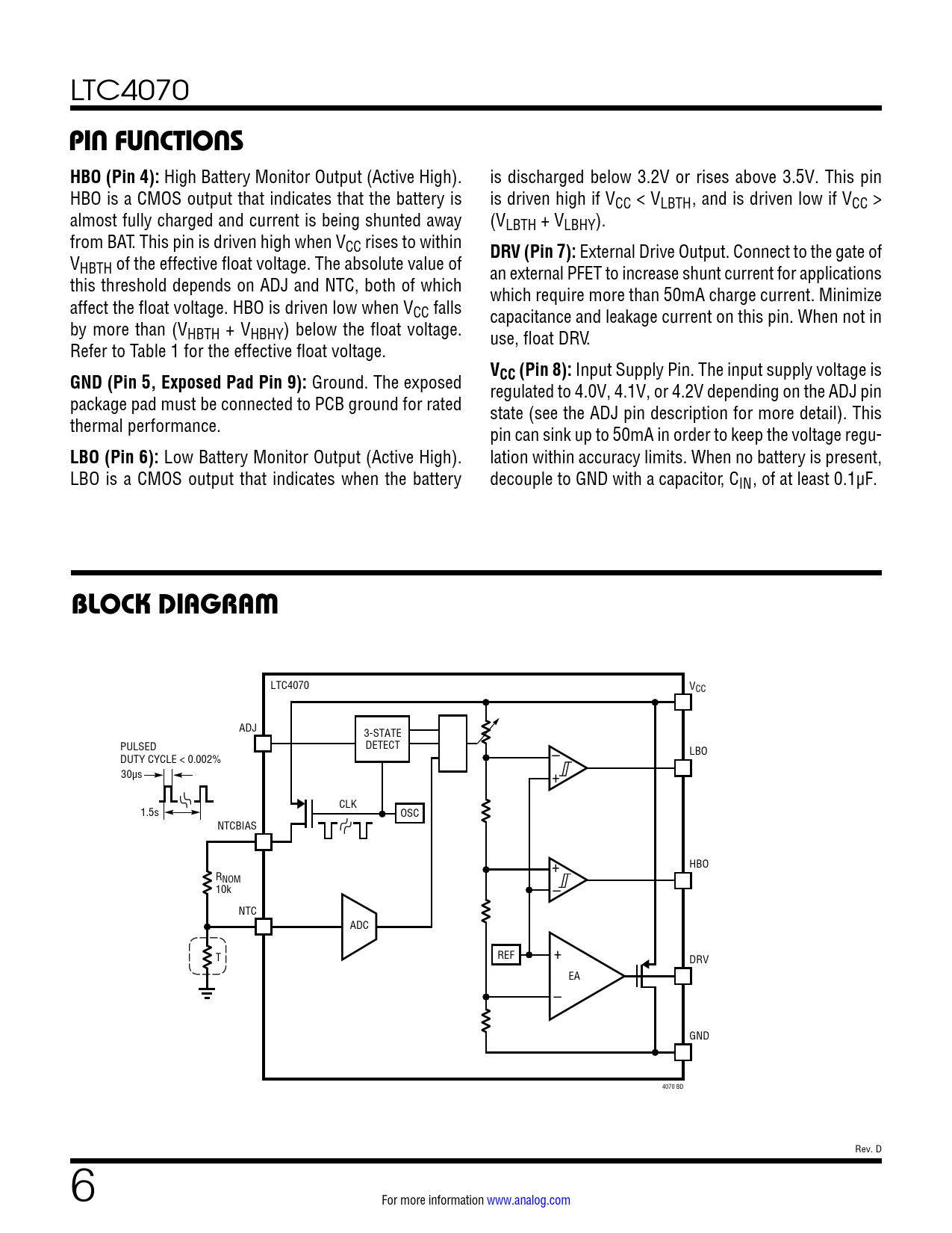 LTC4070 VCC ADJ 3-STATE PULSED DETECT LBO DUTY CYCLE < 0.002% – 30µs + CLK 1.5s OSC NTCBIAS + HBO RNOM 10k – NTC ADC T REF + DRV EA – GND 4070 BD Rev. D 6 For more information www.analog.com Document Outline Features Applications Typical Application Description Absolute Maximum Ratings Pin Configuration Order Information Electrical Characteristics Typical Performance Characteristics Pin Functions Block Diagram Operation Applications Information Typical Applications Package Description Revision History Typical Application Related Parts
