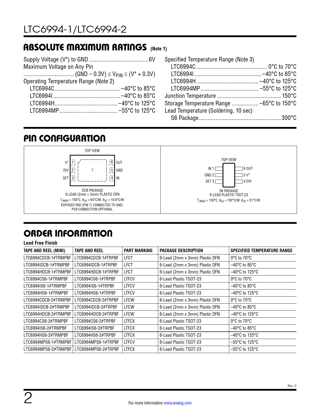 LTC6994CDCB-1#TRMPBF LTC6994CDCB-1#TRPBF LFCT 6-Lead (2mm x 3mm) Plastic DFN 0°C to 70°C LTC6994IDCB-1#TRMPBF LTC6994IDCB-1#TRPBF LFCT 6-Lead (2mm x 3mm) Plastic DFN –40°C to 85°C LTC6994HDCB-1#TRMPBF LTC6994HDCB-1#TRPBF LFCT 6-Lead (2mm x 3mm) Plastic DFN –40°C to 125°C LTC6994CS6-1#TRMPBF LTC6994CS6-1#TRPBF LTFCV 6-Lead Plastic TSOT-23 0°C to 70°C LTC6994IS6-1#TRMPBF LTC6994IS6-1#TRPBF LTFCV 6-Lead Plastic TSOT-23 –40°C to 85°C LTC6994HS6-1#TRMPBF LTC6994HS6-1#TRPBF LTFCV 6-Lead Plastic TSOT-23 –40°C to 125°C LTC6994CDCB-2#TRMPBF LTC6994CDCB-2#TRPBF LFCW 6-Lead (2mm x 3mm) Plastic DFN 0°C to 70°C LTC6994IDCB-2#TRMPBF LTC6994IDCB-2#TRPBF LFCW 6-Lead (2mm x 3mm) Plastic DFN –40°C to 85°C LTC6994HDCB-2#TRMPBF LTC6994HDCB-2#TRPBF LFCW 6-Lead (2mm x 3mm) Plastic DFN –40°C to 125°C LTC6994CS6-2#TRMPBF LTC6994CS6-2#TRPBF LTFCX 6-Lead Plastic TSOT-23 0°C to 70°C LTC6994IS6-2#TRMPBF LTC6994IS6-2#TRPBF LTFCX 6-Lead Plastic TSOT-23 –40°C to 85°C LTC6994HS6-2#TRMPBF LTC6994HS6-2#TRPBF LTFCX 6-Lead Plastic TSOT-23 –40°C to 125°C LTC6994MPS6-1#TRMPBF LTC6994MPS6-1#TRPBF LTFCV 6-Lead Plastic TSOT-23 –55°C to 125°C LTC6994MPS6-2#TRMPBF LTC6994MPS6-2#TRPBF LTFCX 6-Lead Plastic TSOT-23 –55°C to 125°C Rev. C 2 For more information www.analog.com Document Outline Features Applications Typical Application Description Absolute Maximum Ratings Pin Configuration Order Information Electrical Characteristics Typical Performance Characteristics Pin Functions Block Diagram Operation Applications Information Typical Applications Package Description Revision History Typical Application Related Parts