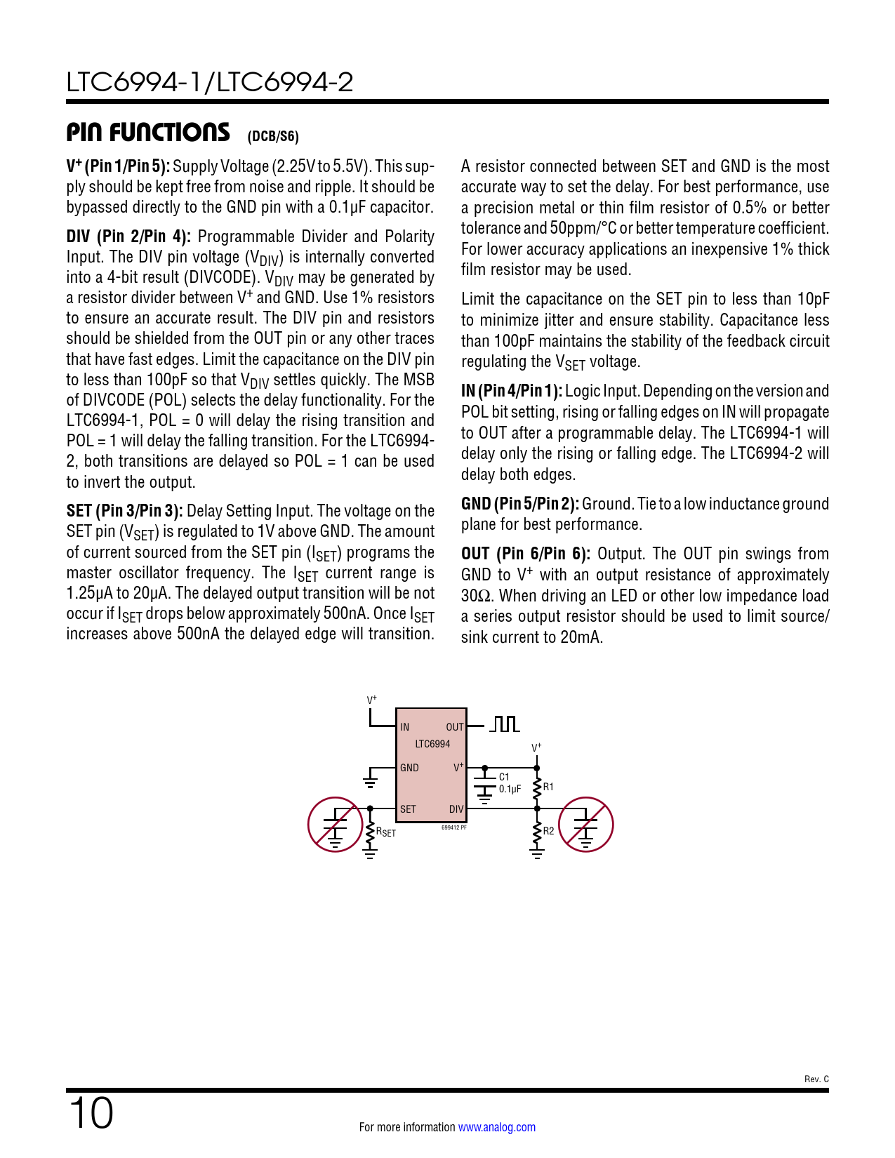 Output. The OUT pin swings from master oscillator frequency. The ISET current range is GND to V+ with an output resistance of approximately 1.25µA to 20µA. The delayed output transition will be not 30Ω. When driving an LED or other low impedance load occur if ISET drops below approximately 500nA. Once ISET a series output resistor should be used to limit source/ increases above 500nA the delayed edge will transition. sink current to 20mA. V+ IN OUT LTC6994 V+ GND V+ C1 0.1µF R1 SET DIV 699412 PF RSET R2 Rev. C 10 For more information www.analog.com Document Outline Features Applications Typical Application Description Absolute Maximum Ratings Pin Configuration Order Information Electrical Characteristics Typical Performance Characteristics Pin Functions Block Diagram Operation Applications Information Typical Applications Package Description Revision History Typical Application Related Parts