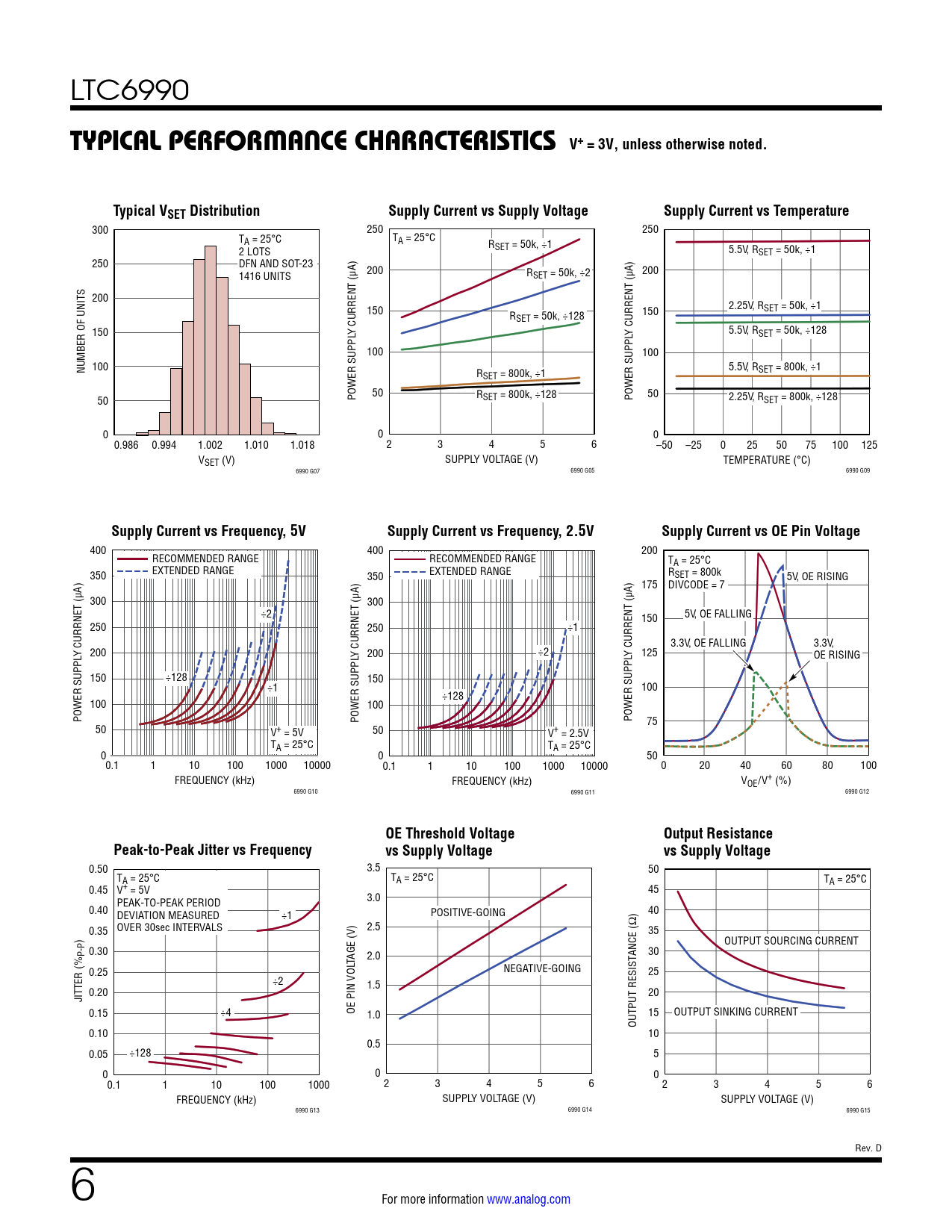 300 250 250 TA = 25°C TA = 25°C R 2 LOTS SET = 50k, ÷1 5.5V, RSET = 50k, ÷1 250 DFN AND SOT-23 1416 UNITS 200 RSET = 50k, ÷2 200 200 150 2.25V, RSET = 50k, ÷1 R 150 SET = 50k, ÷128 150 Y CURRENT (µA) Y CURRENT (µA) 5.5V, RSET = 50k, ÷128 100 100 NUMBER OF UNITS 100 5.5V, R R SET = 800k, ÷1 SET = 800k, ÷1 50 50 50 POWER SUPPL RSET = 800k, ÷128 POWER SUPPL 2.25V, RSET = 800k, ÷128 0 0 0 0.986 0.994 1.002 1.010 1.018 2 3 4 5 6 –50 –25 0 25 50 75 100 125 VSET (V) SUPPLY VOLTAGE (V) TEMPERATURE (°C) 6990 G07 6990 G05 6990 G09