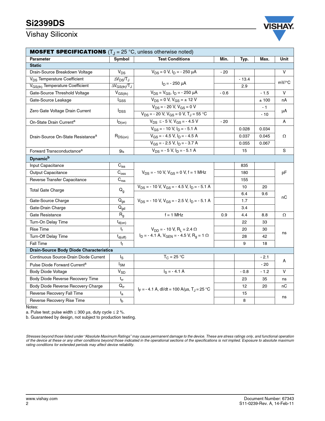 Pages / Page10 / 2 — Si2399DS. MOSFET SPECIFICATIONS. Parameter Symbol. Test. Conditions. Min. …