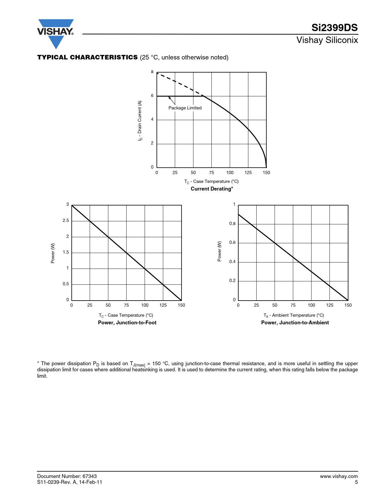* The power dissipation PD is based on TJ(max) = 150 °C, using junction-to-case thermal resistance, and is more useful in settling the upper dissipation limit for cases where additional heatsinking is used. It is used to determine the current rating, when this rating falls below the package limit. Document Number: 67343 www.vishay.com S11-0239-Rev. A, 14-Feb-11 5
