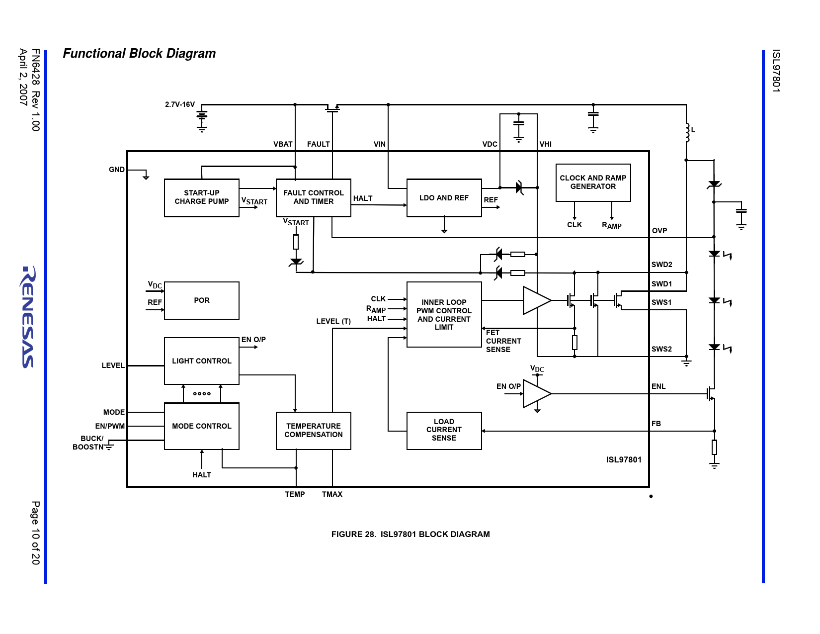 2.7V-16V L VBAT FAULT VIN VDC VHI GND CLOCK AND RAMP GENERATOR START-UP FAULT CONTROL CHARGE PUMP VSTART AND TIMER HALT LDO AND REF REF VSTART CLK RAMP OVP SWD2 VDC SWD1 POR REF CLK INNER LOOP SWS1 RAMP PWM CONTROL HALT AND CURRENT LEVEL (T) LIMIT FET EN O/P CURRENT SENSE SWS2 LIGHT CONTROL LEVEL VDC EN O/P ENL MODE LOAD EN/PWM MODE CONTROL TEMPERATURE FB CURRENT COMPENSATION BUCK/ SENSE BOOSTN ISL97801 HALT