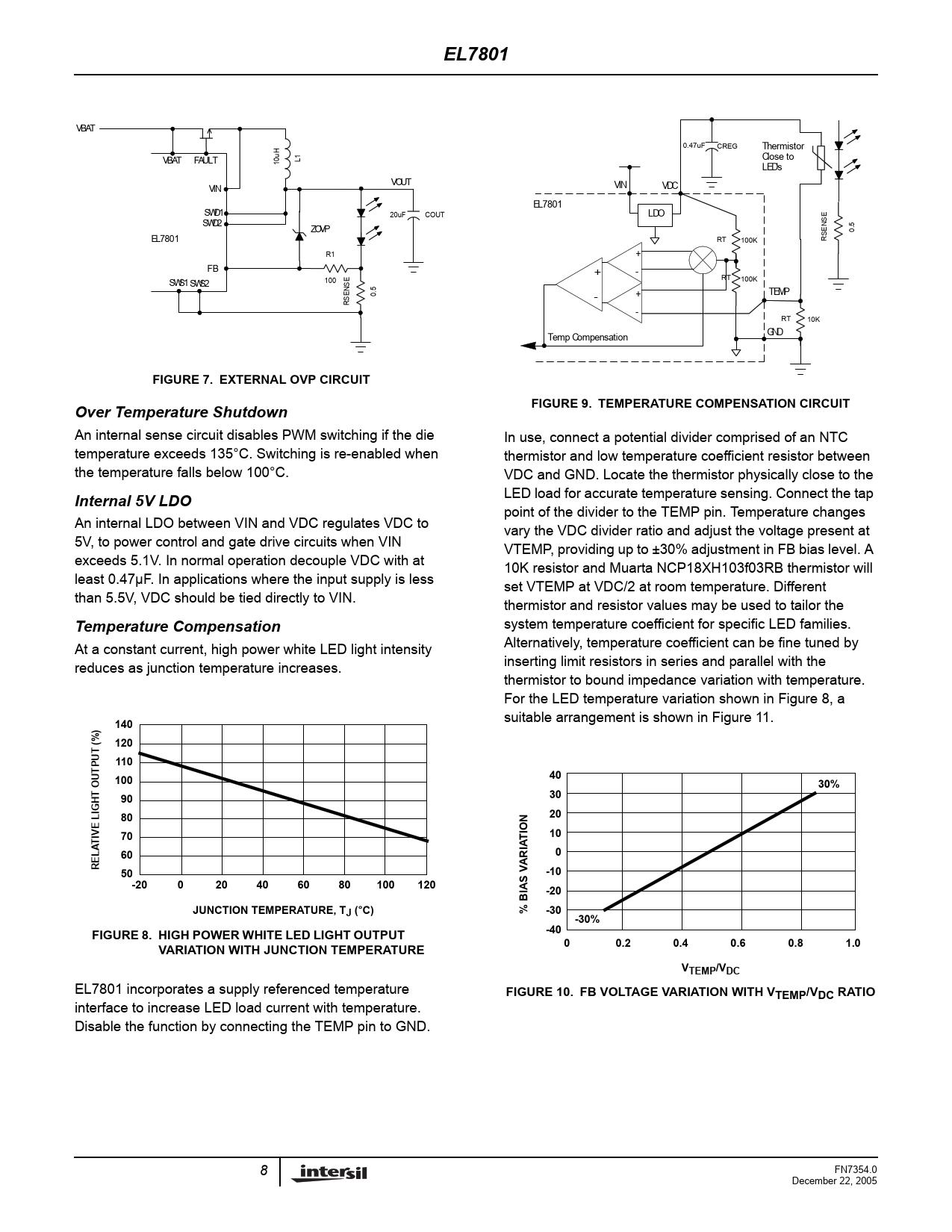 EL7801 VBAT 0.47uF CREG Thermistor H u 0 VBAT FAULT L1 Close to 1 LED's VOUT VIN VIN VDC EL7801 SWD1 20uF COUT LDO E SWD2 S ZOVP N E .5 0 EL7801 S RT R 100K R1 + FB - + 100 E SWS1 RT SWS2 100K S N E .5 0 TEMP + S - R - RT 10K GND Temp Compensation FIGURE 7. EXTERNAL OVP CIRCUITOver Temperature ShutdownFIGURE 9. TEMPERATURE COMPENSATION CIRCUIT An internal sense circuit disables PWM switching if the die In use, connect a potential divider comprised of an NTC temperature exceeds 135°C. Switching is re-enabled when thermistor and low temperature coefficient resistor between the temperature falls below 100°C. VDC and GND. Locate the thermistor physically close to the Internal 5V LDO LED load for accurate temperature sensing. Connect the tap point of the divider to the TEMP pin. Temperature changes An internal LDO between VIN and VDC regulates VDC to vary the VDC divider ratio and adjust the voltage present at 5V, to power control and gate drive circuits when VIN VTEMP, providing up to ±30% adjustment in FB bias level. A exceeds 5.1V. In normal operation decouple VDC with at 10K resistor and Muarta NCP18XH103f03RB thermistor will least 0.47µF. In applications where the input supply is less set VTEMP at VDC/2 at room temperature. Different than 5.5V, VDC should be tied directly to VIN. thermistor and resistor values may be used to tailor the Temperature Compensation system temperature coefficient for specific LED families. At a constant current, high power white LED light intensity Alternatively, temperature coefficient can be fine tuned by reduces as junction temperature increases. inserting limit resistors in series and parallel with the thermistor to bound impedance variation with temperature. For the LED temperature variation shown in Figure 8, a suitable arrangement is shown in Figure 11. 140120110TPUT (%)1004030%T OU30H9020LIG80VEION7010TIT600RELAARIA50V-10-20020406080100120-20BIASJUNCTION TEMPERATURE, TJ (°C)%-30-30%FIGURE 8. HIGH POWER WHITE LED LIGHT OUTPUT-4000.20.40.60.81.0VARIATION WITH JUNCTION TEMPERATUREVTEMP/VDC EL7801 incorporates a supply referenced temperature FIGURE 10. FB VOLTAGE VARIATION WITH VTEMP/VDC RATIO interface to increase LED load current with temperature. Disable the function by connecting the TEMP pin to GND. 8 FN7354.0 December 22, 2005